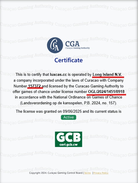 The document on their website shows Long Island N.V., company registration number 157372, and license number OGL/2024/1451/0918.