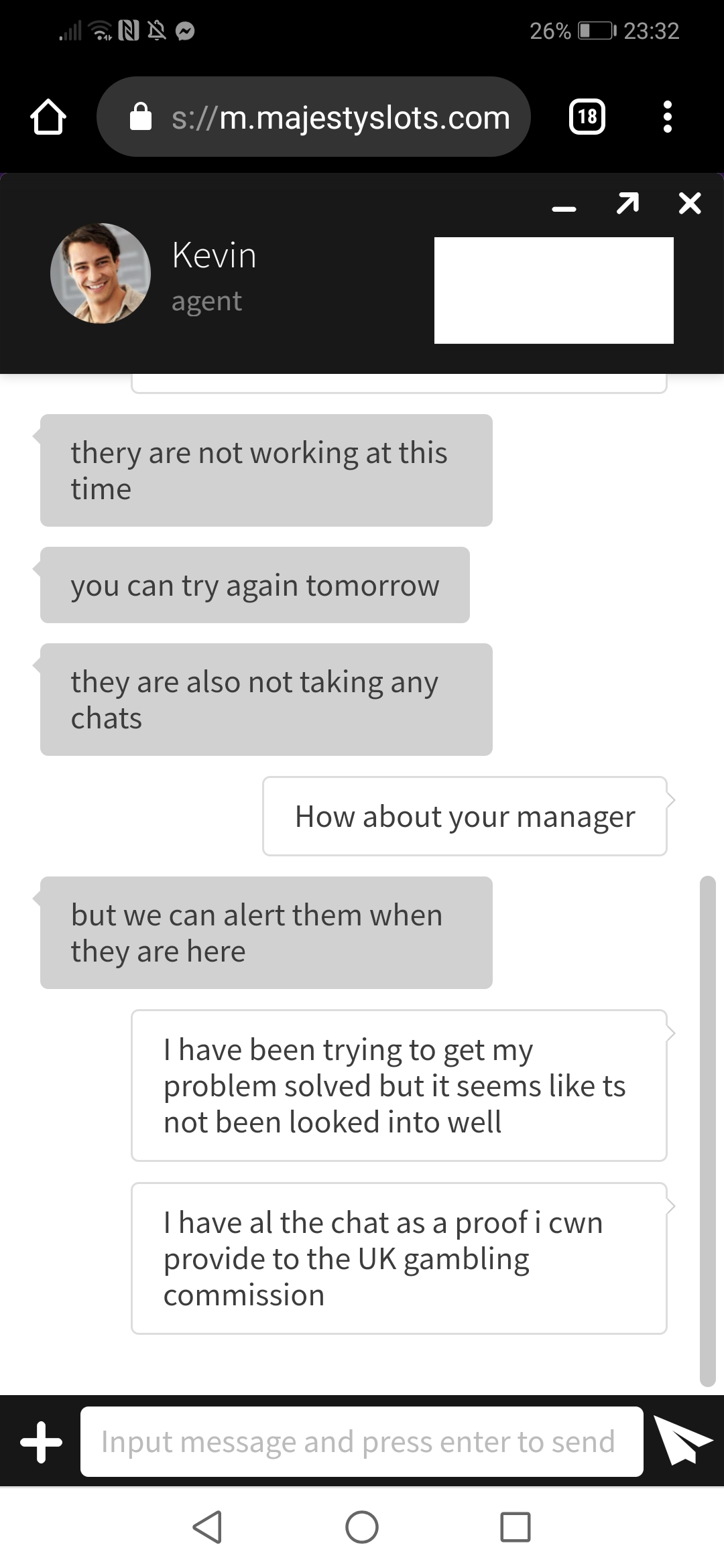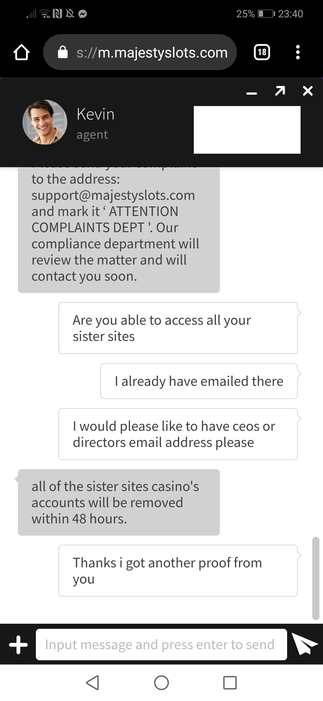 J'ai créé un compte avec une machine à sous classique, puis j'ai demandé la fermeture du compte et le remboursement de tout solde restant, mais ils ont une politique de retrait minimum de 100 euros, j'ai donc dû essayer de gagner ou de déposer plus mais cela ne s'est pas produit, j'ai donc dû forcer le service client. pour fermer mon compte avec l'entreprise et tous leurs sites sœurs, mais vous ne l'avez pas fait et je me suis retrouvé avec une perte financière, j'ai donc demandé un remboursement et je ne réponds même pas à mes e-mails lorsque je contacte le service client, ils gardent le message par e-mail, mais j'ai déjà envoyé un e-mail les 5 derniers jours et je n'obtiens aucune réponse. J'ai tous les documents nécessaires et vous pouvez également demander les journaux de discussion aux deux. entreprises, j'espère que vous pourrez aider.