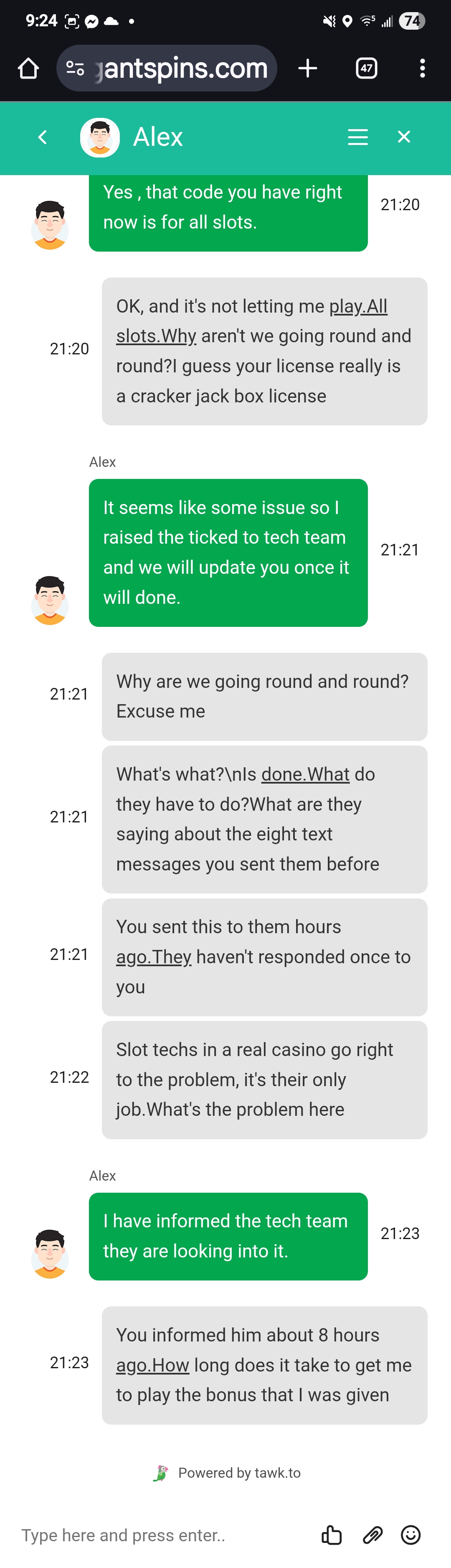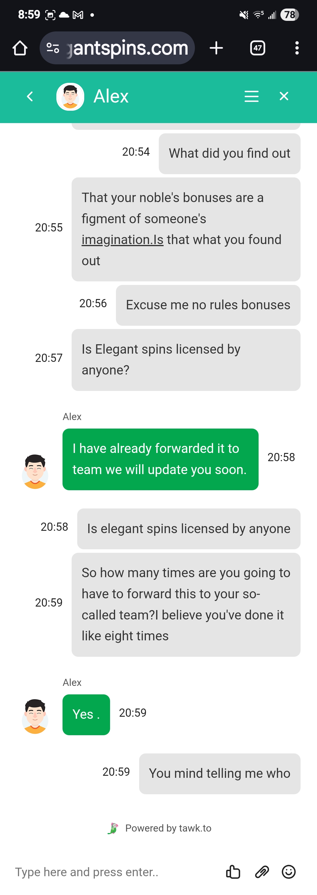 I deposited with elegant spins last night 75% no rules bonus is eligible for all slots. Started playing and I kept finding games that I couldn't get into: "oops.This game isn't available" oops page can't be found. So went to customer service i spoke with Alex. turned into a five hour conversation which was a bunch of garbage run around nonsense. Basically , it was not a rules bonus , and it was not for all slots even though this kept telling me it was because I was locked out of several games. About 8 times over the 5 hours, he said he was looking into it.And he would be back. And then when he finally came back he would say he was going to notify his technical team of the situation. So I would go and come back , go and come back , and he would say the same thing , every time if he answered at all. I'm gonna send a last conversation at the end of the night.You'll see what i'm talking about. I would not play at this casino again if it was the last casino on earth.