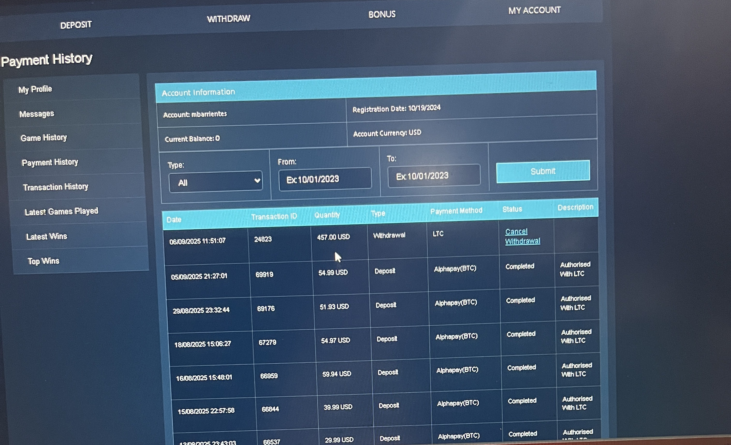 Le 09/06/2025, j'ai demandé un retrait de 457,00 $, qui a été confirmé (ID de transaction : 24823) pour recevoir mon adresse Litecoin. J'ai contacté le support à trois reprises (les 09/06, 09/07 et 09/08) concernant mon retrait. J'ai reçu deux réponses, les 09/07 et 09/2025, indiquant que mon retrait serait traité sous 2 à 4 heures, mais je n'ai pas reçu de réponse. J'ai contacté le support par chat les 10, 11, 13, 14, 17, 19 et 20 septembre 2025, à sept reprises. J'ai reçu des excuses et on m'a dit que mon retrait serait traité prochainement. Chaque personne du support m'a assuré que mon retrait serait transmis à l'équipe des paiements et qu'il serait traité prochainement. Je n'ai reçu aucun e-mail du support m'indiquant qu'un problème expliquait le non-traitement de mon retrait. J'avais déjà effectué des retraits sur ce casino sans problème jusqu'à présent. J'ai également demandé à discuter avec un responsable, mais on m'a répondu que ce n'était pas possible pour le moment. J'ai donné 14 jours (2 semaines) au casino pour traiter mon retrait, alors que le délai de traitement est de 2 à 4 heures (selon les conditions générales, mes retraits précédents et la première notification par e-mail du support). Je ne sais pas quoi faire d’autre que de déposer une plainte.