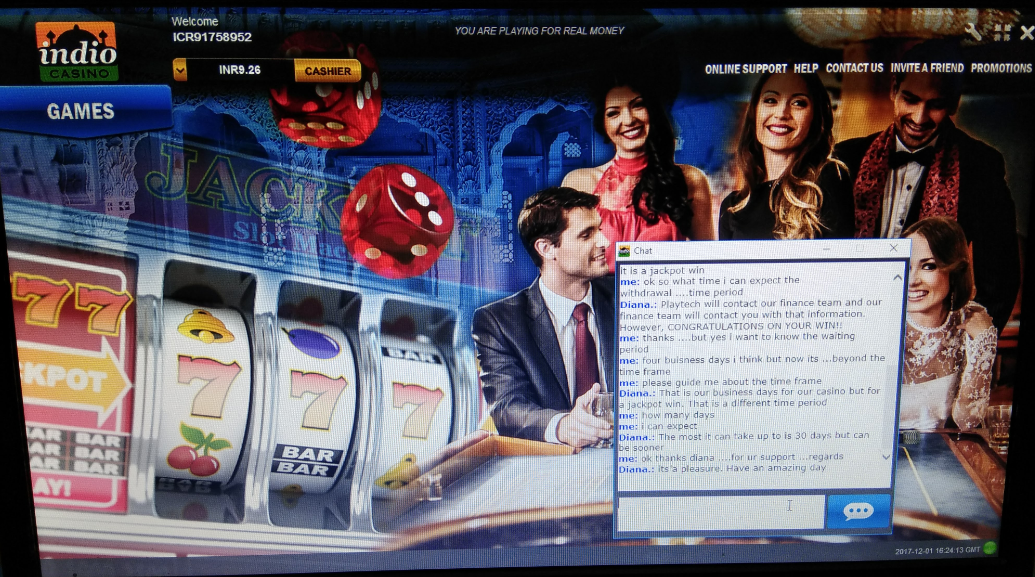 i ve played frankie dettoris roulete on indio casino and win a progressive jackpot of aprox 44 lakhs INR..but after a long wait they didnt process my jackpot winning amount...before (nov )christmas 2017...from then onwards they make excuses that finanace team is on leave finance team is working on it etc etc ....but they diddnt process my amount its realy sad for me coz i am a middle class person and being a lady if a play with my hard earned money ..so they have to process that amount...if such kind of casino exists like INDIO Casino....then the whole casino freternity is blacklisted by true players it will bring shame to other casino as well..the game is powered by palytech and i ve contacted palytech as well but they told me to contact indio casino...when i v e requested to fund my account for play they have reverse the whole jackpot amount to my playing id to play this bulshit casino Again.....instead of processing to my bank account.what a shame that means u r sitting on my jackpot winning since 6 months and still not refunded ....i dont know what to say if any body from casino freternity will able to help me out with this ...i hope...My ID in indio casino is ICR91758952.