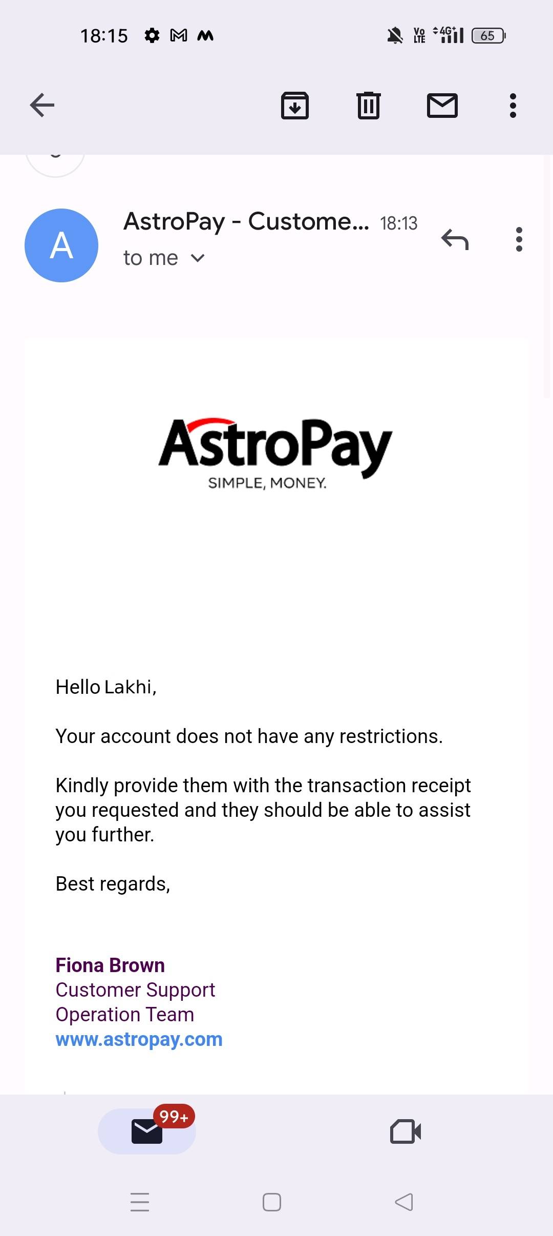 Now on 27 they say it's not our issue it's my astropay issue but i recvied from others casino also n astropay also confirm it there is no issue please check out my documents i submitted