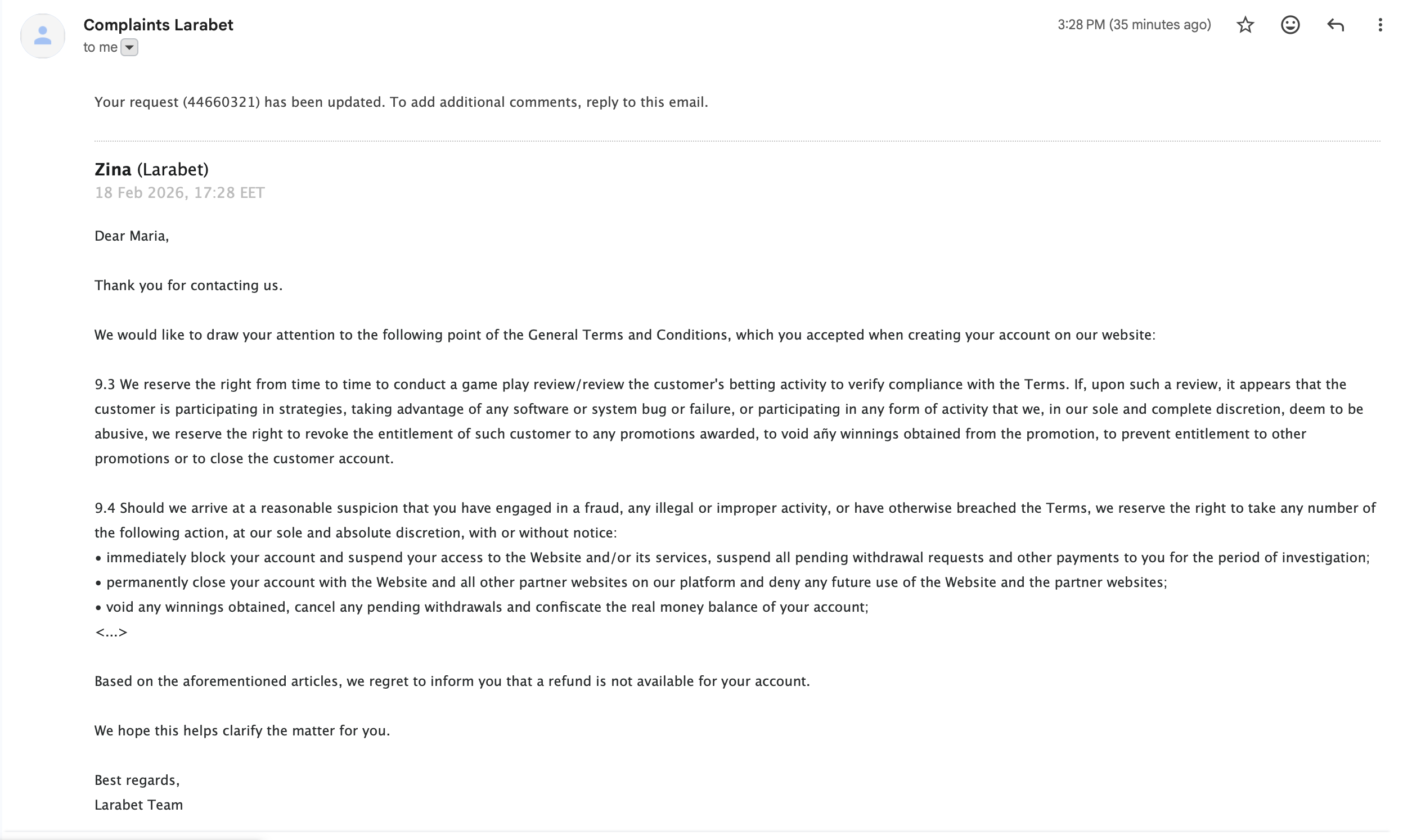 We have received a response from the casino representative, and they have provided the same explanation as in their email to you: stating that there was a breach of clauses 9.3 and 9.4 of their Terms and Conditions and that their decision is final.