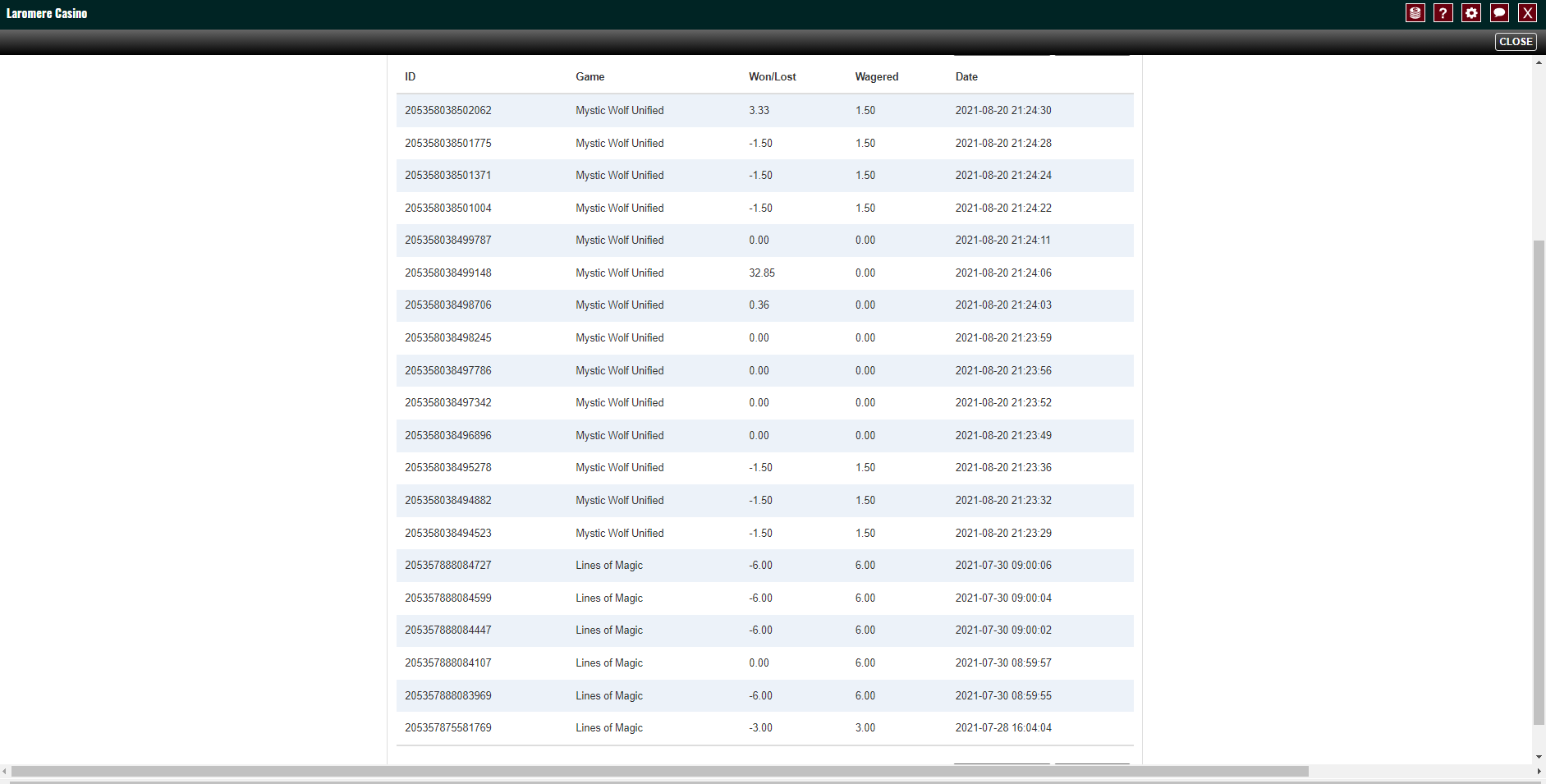 And there is a many wagering at 20.08.2021 (more than 25 EUR even in Mystic Wolf slot game)