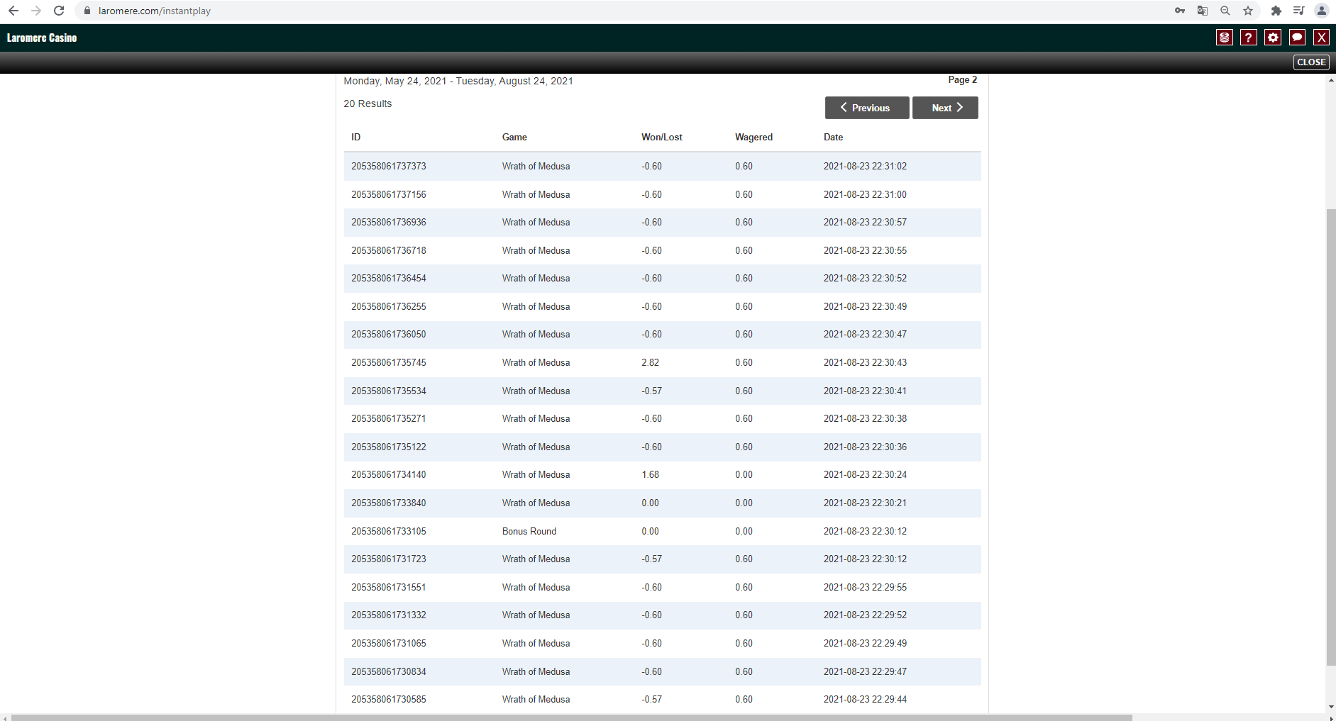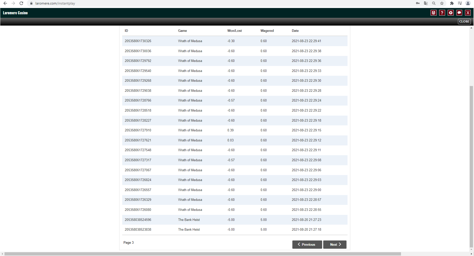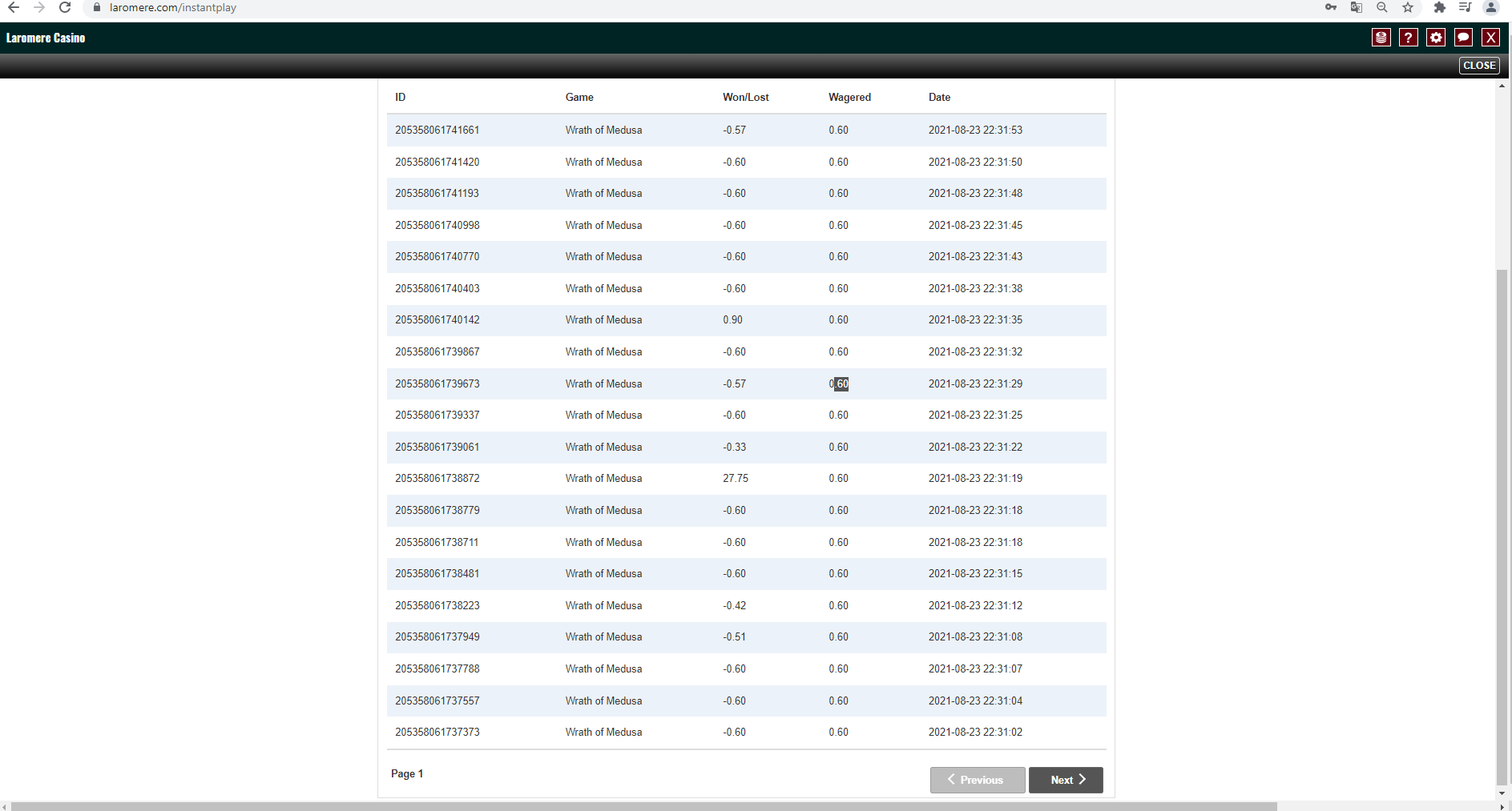 Ces propos du support de chat sont faux à cent pour cent, je ne comprends pas pourquoi ils disent cela, car tout l'historique des paris peut être consulté et je n'ai pas joué à ces machines à sous après le dépôt (chariots de feu et colère de méduse), et mes conditions de pari ont été remplies après le dépôt (qui a été effectué le 30/07/21 à 09:07:02), j'ai rempli mes "conditions de mise de dépôt" en jouant uniquement à deux jeux de machines à sous Mystic wolf et Bank Heist (jeu du 20.08.21 session, 60 euros de mise au total)