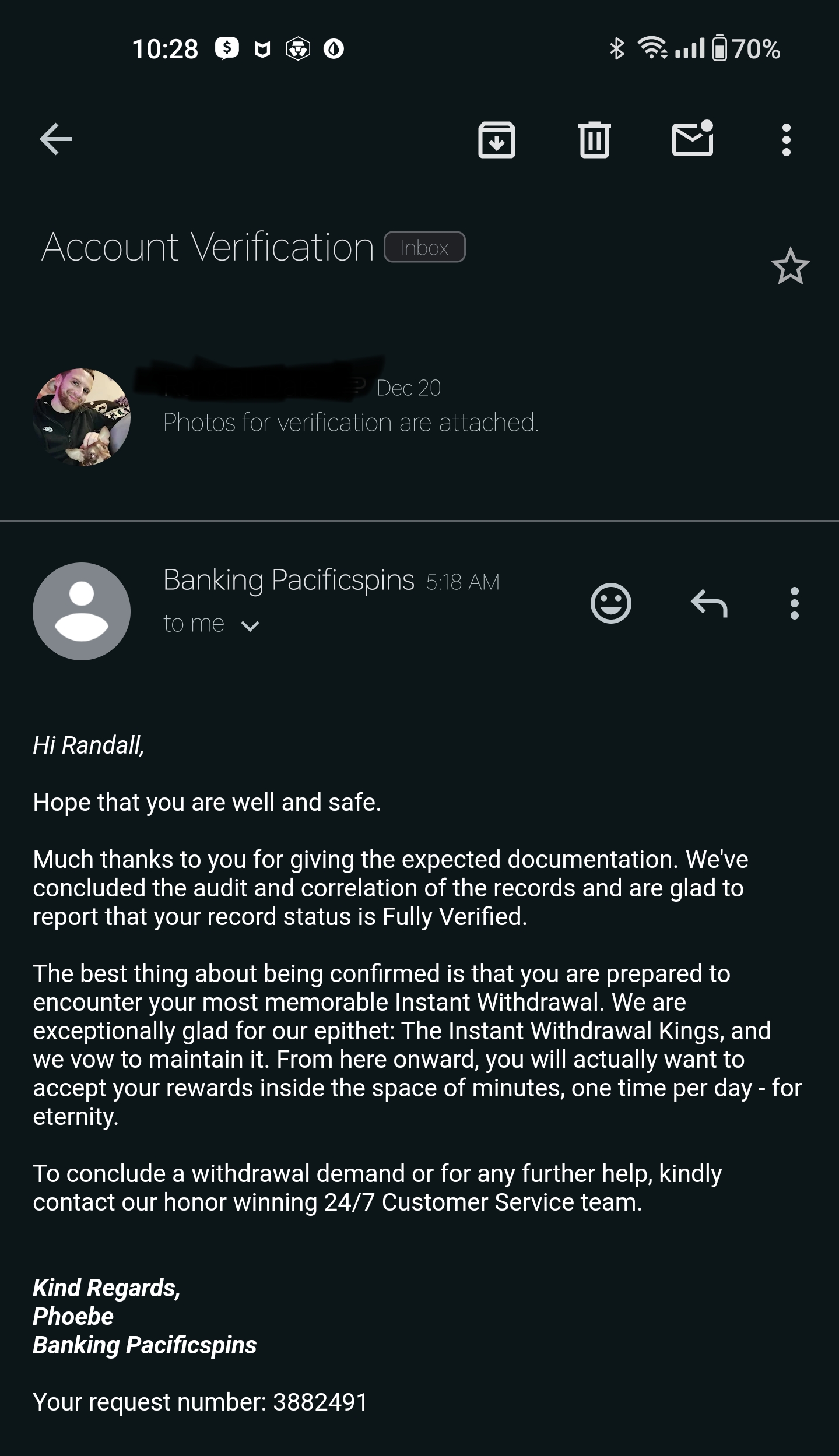 Anyways so I submitted my verification 2 full business weeks ago now and have been going back and forth with their support via email because they said the process is supposed to take "several business days" which I know isn't a specific number - but I'm pretty sure most people would expect "several business days" to be at the most 5 business days - in my case it's been 10 business days and they just keep giving me the same generic copy/paste template responses on email... I finally got a bit more of what appeared to be a custom written response after I pressed them a few nights ago - tldr i basically told them that Brango, Yabby and BonusBlitz all completed my verification in about 4-5 business days and gave me no issues - whereas PacificSpins is the only one who appears to be unwilling to pay customers winnings... Which I guess triggered them to respond with a bit more effort finally... One of the things they said for me to do was to email their banking email address asking for a status update - which I did, but of course I still haven't heard back from the banking email - in fact, I've never once seen any sign of life from the banking email address...