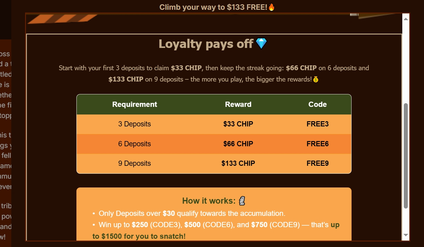 hi jovanav, I attached a screenshot of the message i received in my casino inbox and it says : Start with your first 3 deposits to claim $33 chip, then keep the streak going: $66 chip on 6 deposits and $133 chip on 9 deposits-the more you play, the bigger the rewards!