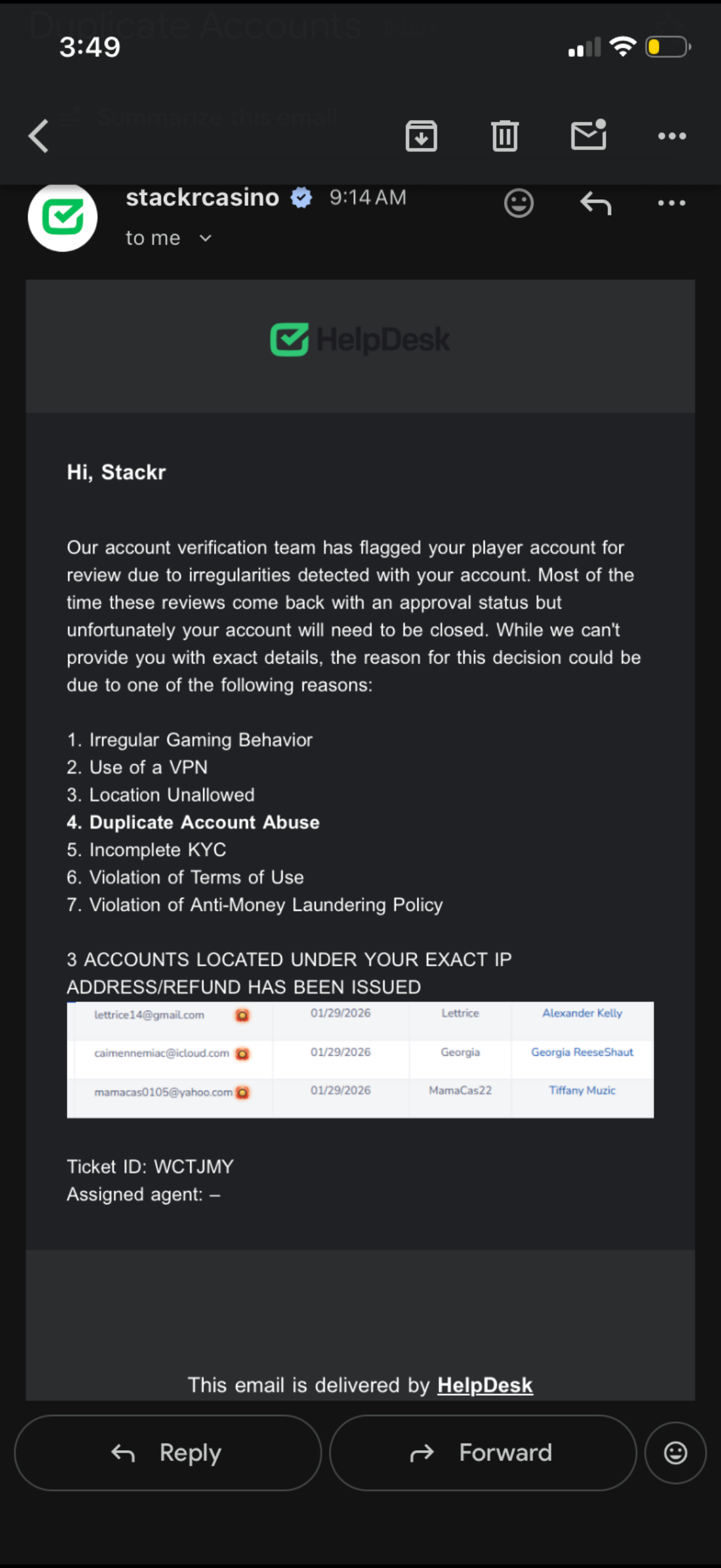I helped about 6 people with referring them to the site and 3 of them needed help so I helped them with making purchases and how the promotions worked and redemptions. The next morning all of our accounts were banned and they all had a minimum of $500 to $1000 in each account. Screw stacker casino stay away!!!!! They will steal your money with any excuse they can, I play on 40 different online casinos and have never been treated like this straight robbed me of my money as well as my friends money as well.