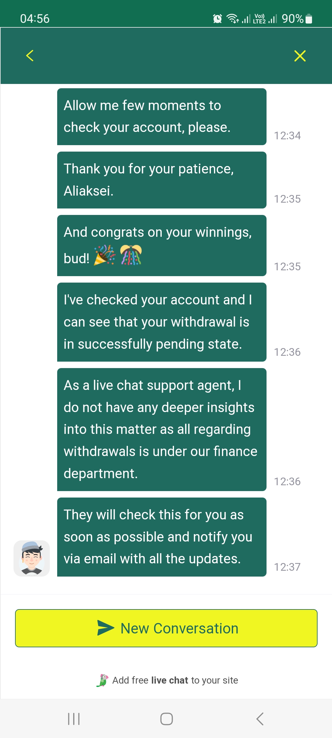 Bonjour.Aujourd'hui, j'ai reçu une réponse du service financier du casino finance bet24-7.Dans laquelle ils sont vraiment désolés pour le retard de paiement et s'efforcent de l'accélérer.Ils ont un délai de paiement de 48 heures, et c'est ça fait déjà 12 jours !!! Il me semble qu'ils retardent délibérément le paiement sous n'importe quel prétexte. Je poste une capture d'écran d'un email auquel j'ai vraiment envie de croire, mais ça ne marche pas.