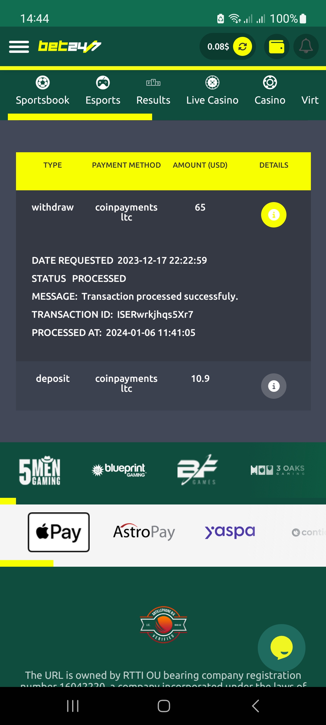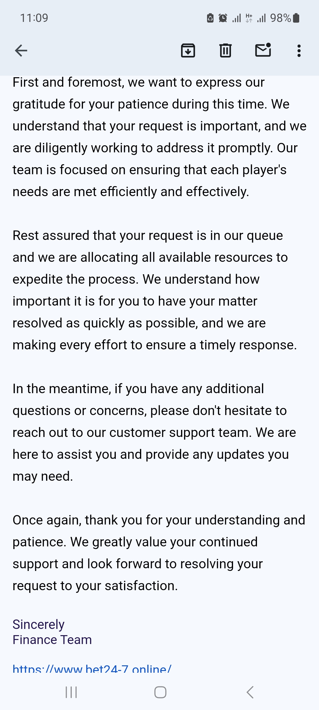 Hello.Today I received a response from the financial service of the casino finance bet24-7.In which they are very sorry for the delay in payment and try very hard to speed it up.They have a payment deadline of 48 hours, and it's already been 12 days!!! It seems to me that they are deliberately delaying the payment under any pretext.I'm posting a screenshot of an email that I really want to believe in, but it doesn't work out.