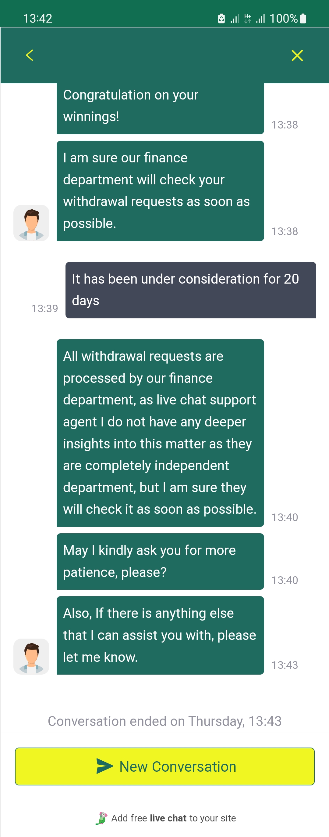 Hello.It has already been 21 days, and the payment of funds from the casino has not been received. There is no response from the finance department-silence.I wrote to the support service with an unambiguous answer, we are not engaged in withdrawing funds, but the finance department will definitely pay, expect. I am sending you a screenshot.