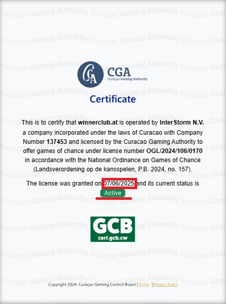 The document published on the winnerclub.at website lists InterStorm (Curaçao) N.V. (company registration number 137453) as the license holder and references license number OGL/2024/106/0170, stating that the license was issued on 07.06.2025 and that its current status is ACTIVE. However, this information is inconsistent with the license status displayed on the official Curaçao Gaming Authority (GCA) website.