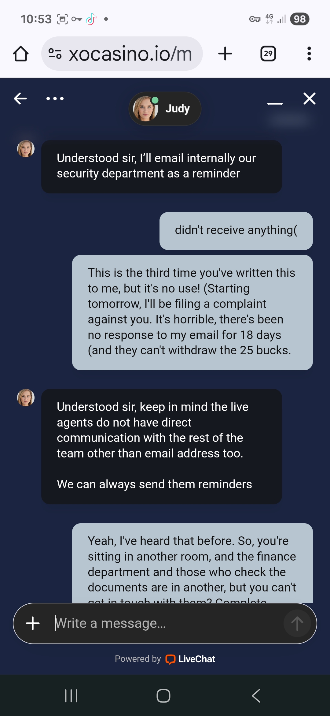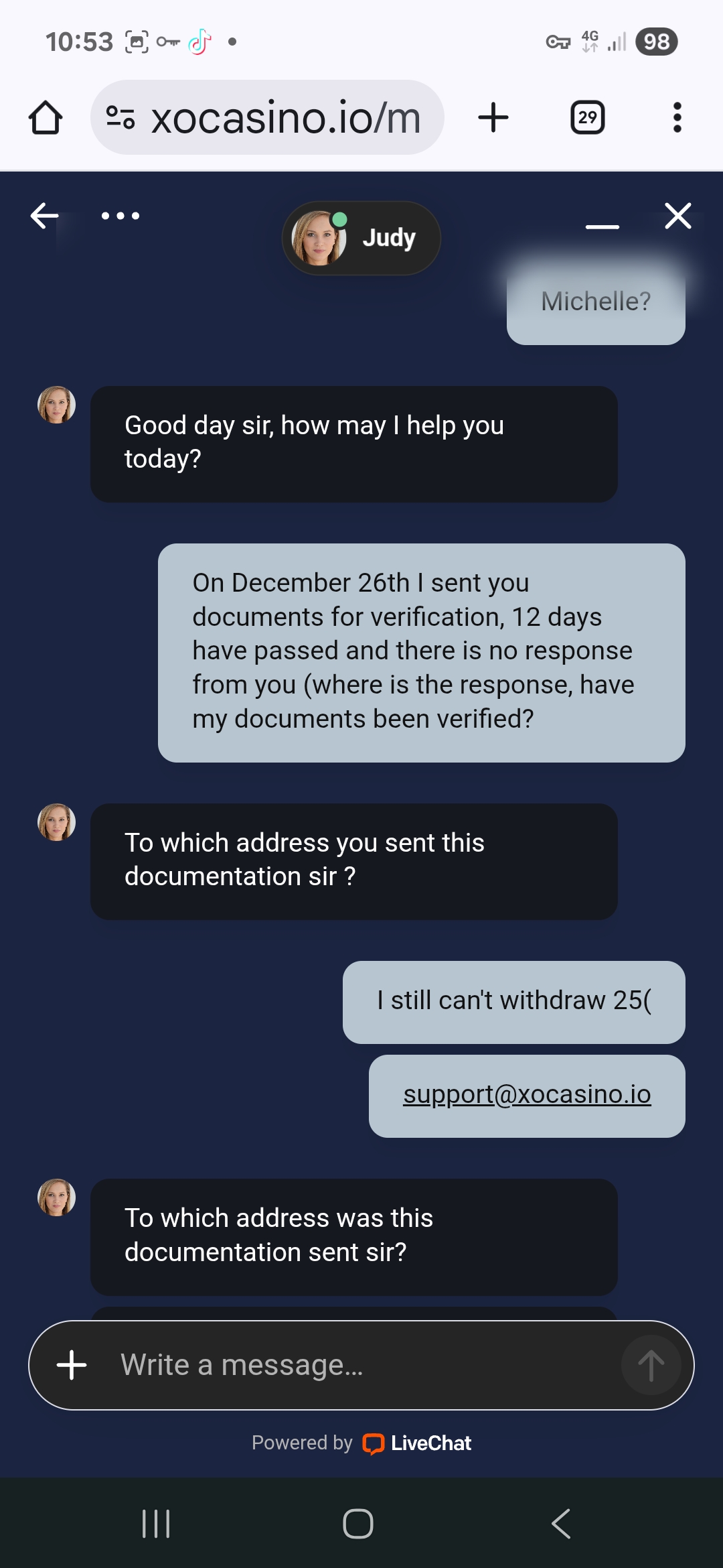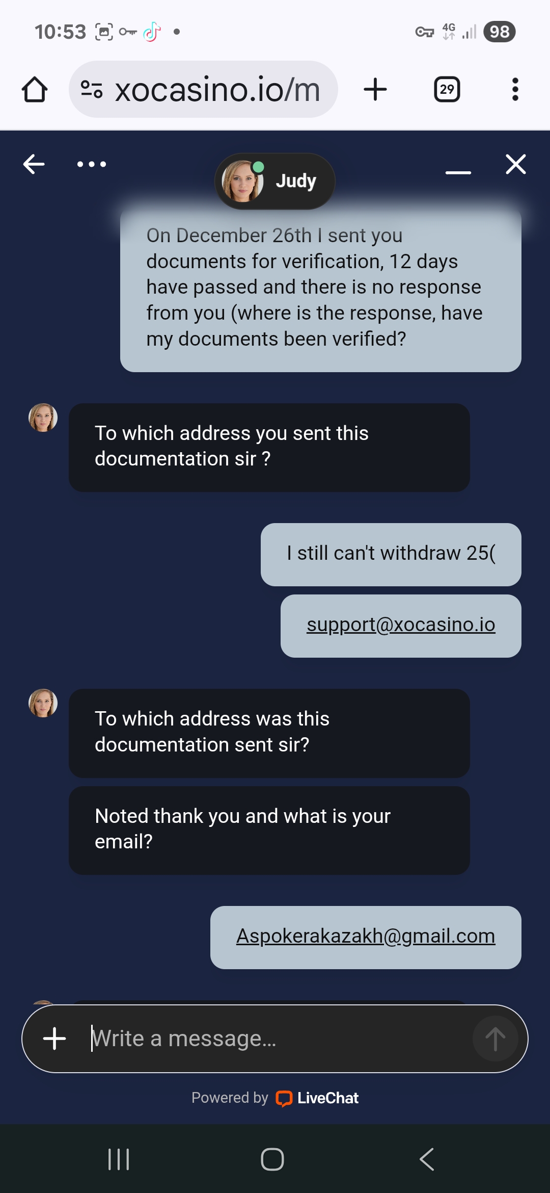 I registered at Oxcasino.io on December 26, 2025. They gave me a $25 no-deposit bonus and a $25 maximum withdrawal. I cleared it immediately, and it went into my real account. I wanted to withdraw, but they told me I needed verification in the chat. I emailed them all my documents. As of today, there's been no response, neither to the email nor on the website, nor even at the casino. I've written in the chat numerous times, but to no avail. They keep making promises, and we're told the document checkers can't show up. I've written to them that it's urgent, and they've basically ignored me. It's been 21 days and there's been no response. I'm asking for help with this. It's not the $25, but the principle of it. They said I'd be able to withdraw to crypto as soon as they verify my documents, but they haven't verified anything. This is the first time I've seen a casino like this.