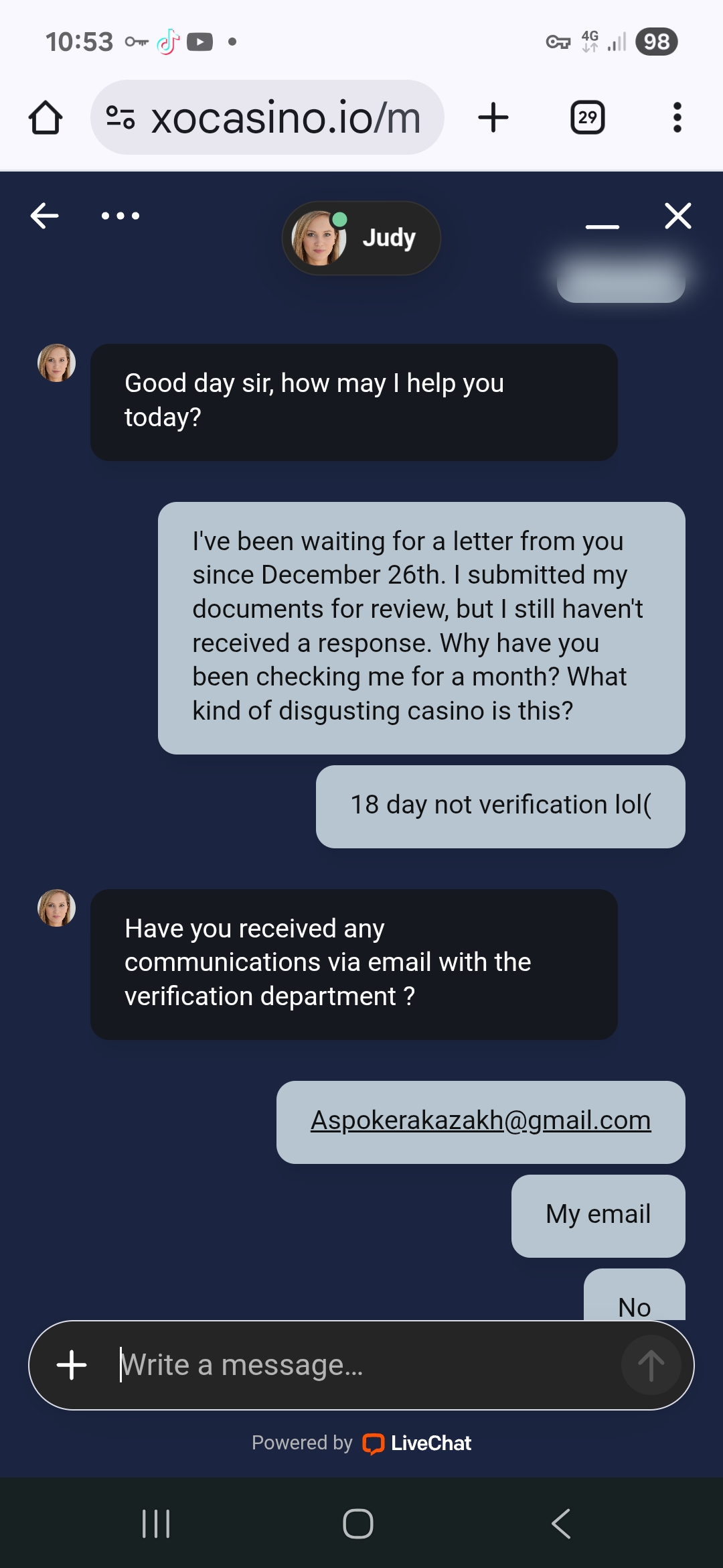 However, it would be helpful if you could provide as much evidence as possible via private message, such as screenshots of your live chat conversations or any emails you received from the casino.