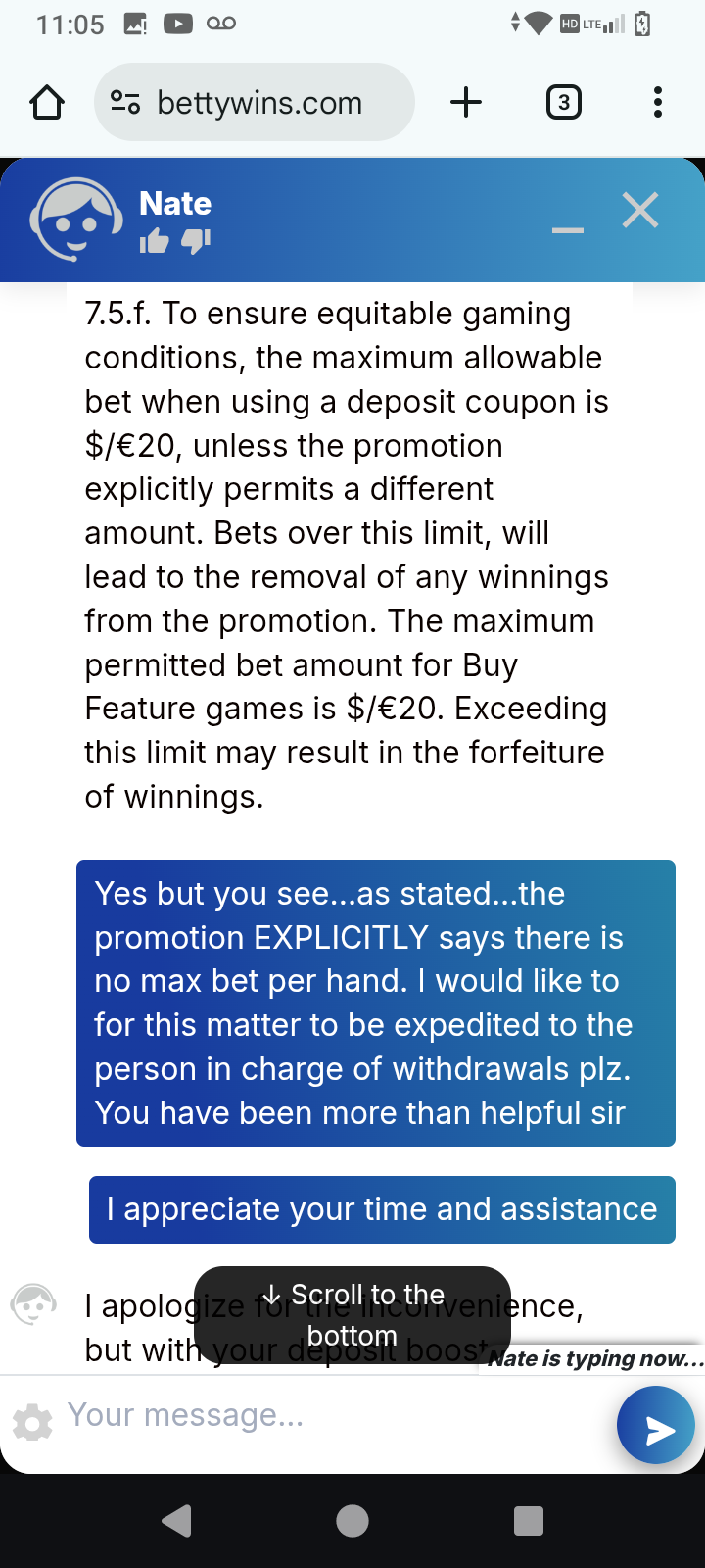 J'espère que vous allez bien et que vous êtes en sécurité.Après examen de votre compte et des détails de votre demande, nous avons constaté que les conditions de la promotion n'avaient pas été mises à jour comme prévu. Par conséquent, lorsque notre agent vous a indiqué qu'il n'y avait pas de mise maximale par main, il reflétait fidèlement les informations affichées dans le cadre de la promotion à ce moment-là.