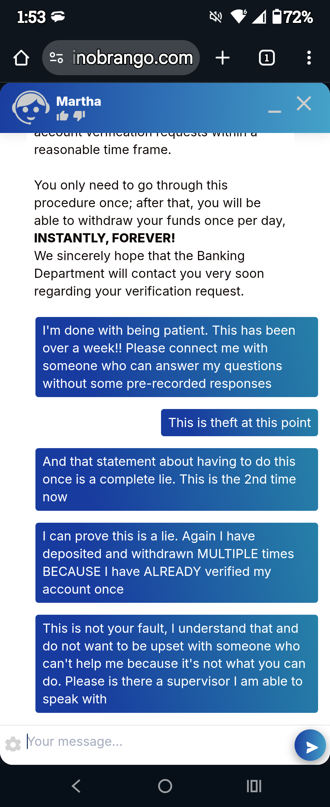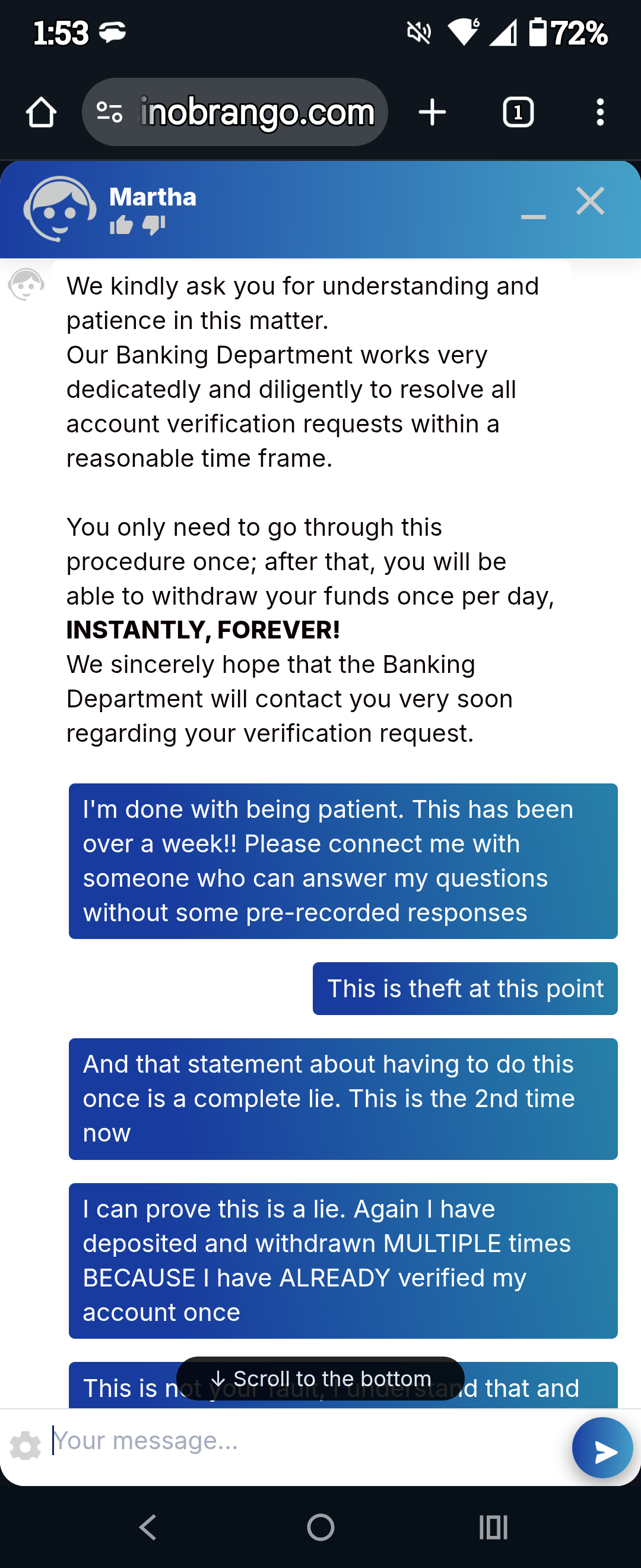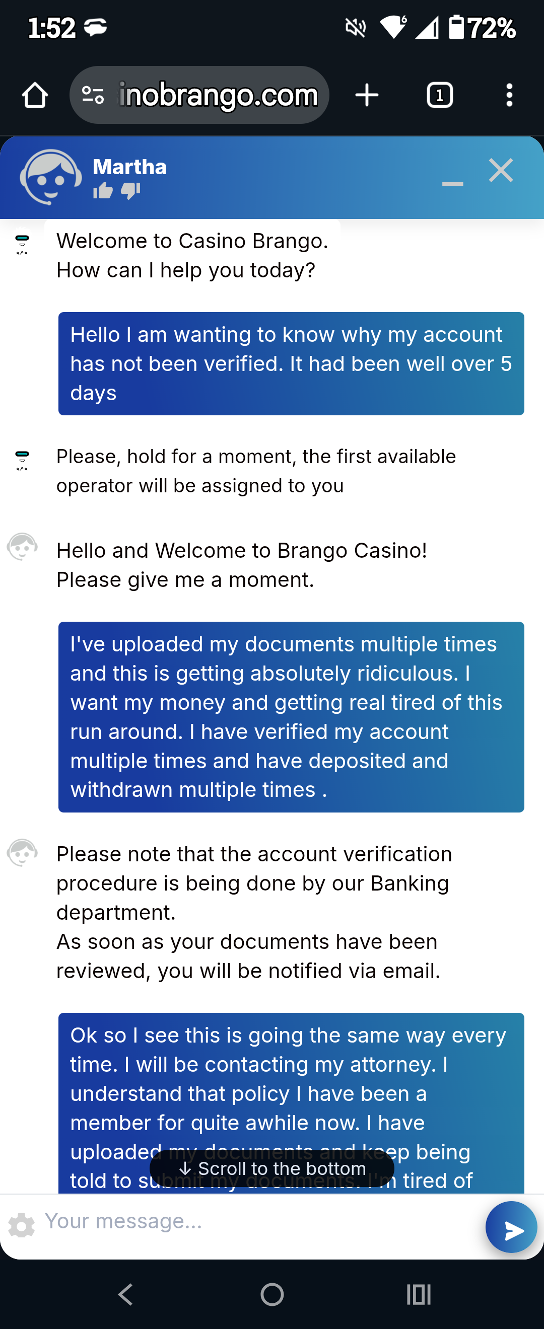 Mon mari rencontre de sérieux problèmes pour récupérer son argent chez Brango. Nous sommes tous les deux titulaires d'un compte depuis deux ans et avons effectué de nombreux dépôts et retraits, car nous avons vérifié notre compte conformément aux règles du site. Il a essayé de retirer de l'argent il y a une semaine et n'a rien obtenu, si ce n'est des tergiversations : on lui a demandé de télécharger des documents pour vérifier son identité. Nous avons téléchargé les documents au moins cinq fois et on nous le demande sans cesse. Et le chat est inutile, car personne ne nous répond, à part des tergiversations ! Comment est-ce possible ? Ils mentent et prétendent qu'il suffit de faire cette procédure une seule fois… et pourtant, nous tournons en rond juste pour retirer 100 $ !