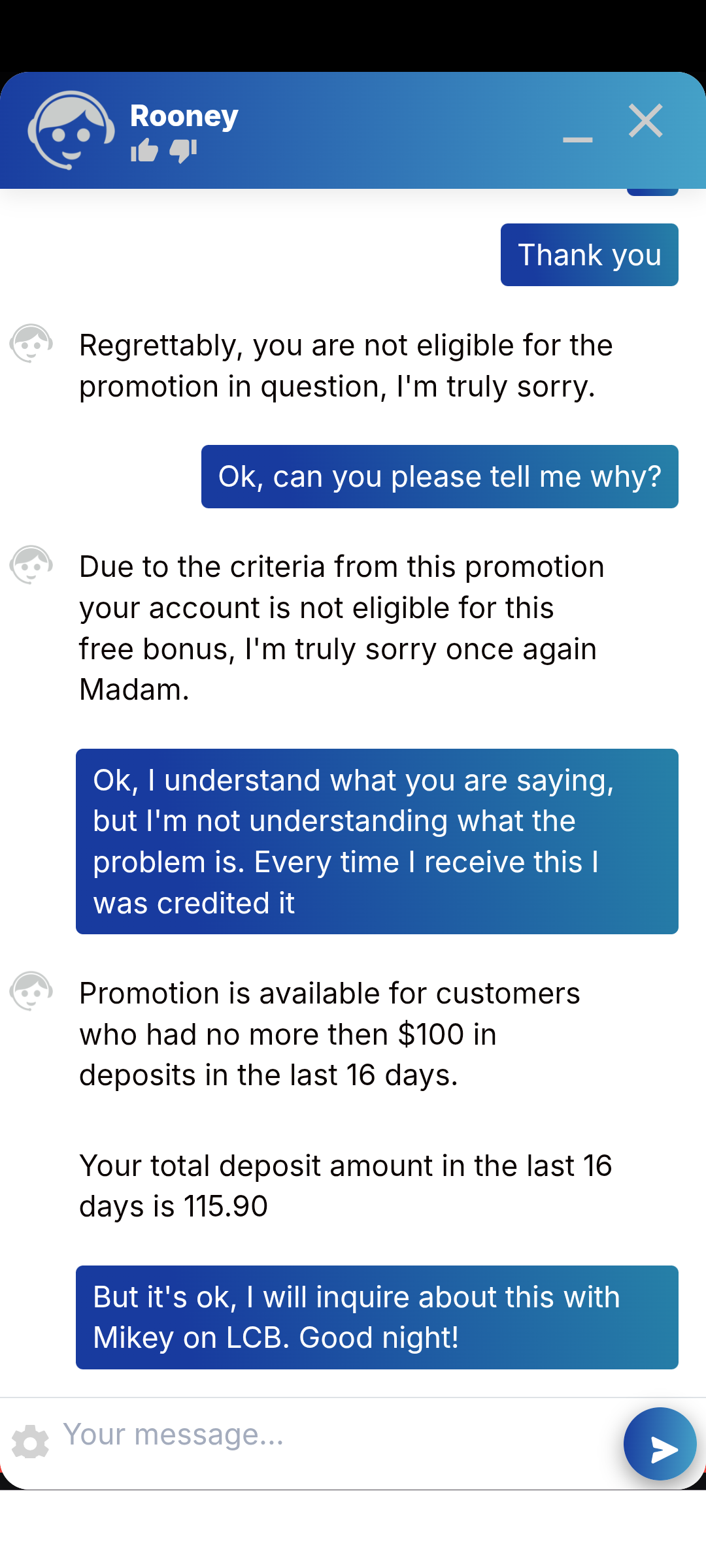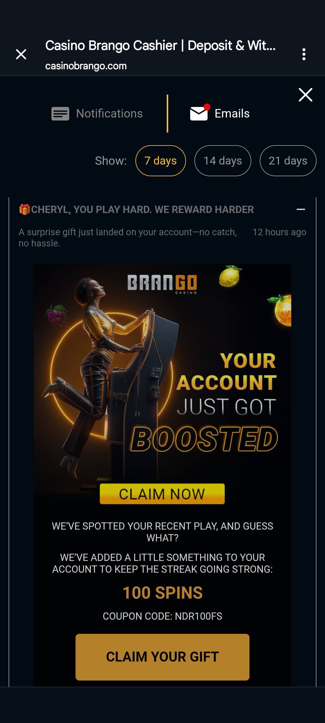 I'm having an issue with two email rewards received from Brango and Extreme. I have received and redeemed these same coupons several times previously without a problem. This time however, neither chat representatives would honor them. I deposited many times throughout the week, so that's not the issue. The response I received from Extreme is pretty crazy, and I'm hoping that it's not true, and instead chat has the wrong information. So I was told I am not eligible for this reward because it's only for guests that have deposited no more than $100 in the past 16 days. Apparently I deposited $115. I'm trying to figure out why in the world a casino would discourage players from depositing too much money, because if they do, they will not be rewarded for their play by way of coupons emailed to them that state they are rewards for my play! I'm laughing at the absurdity of this, but also irritated because I was looking forward to playing last night, only to be given this weird explanation. Just look at the wording on the emails. "You play hard, we reward harder", and "A surprise gift just landed in your account, no catch, no hassle ". Seems there is a catch, and it's definitely been a hassle. What I'm hoping for is that the gifts I earned with my loyal playing be promptly redeemed, with much thanks by the way. Or if not, please state the rules that have suddenly become applicable clearly. Hey, it makes no sense to me, but if it's truly a rule that depositing more than $100 in 16 days to redeem my gifts, I promise to never deposit one cent over. Definitely will save me some money honey! Brango would not give me a reason why their coupon could not be rewarded to me. Despite wording on their email like " We've noticed that you've been active lately, so we've dropped something special into your account as a thank you ". They both came on the same date, and I couldn't wait until after work to settle in, put on my pajamas, grab a glass of wine, and play. Mikey, can you please assist me with this? I know you can understand my confusion and disappointment with this whole situation. Thank you kindly for taking the time to take a look at this, and let me know what you find out. Best Regards, chercain/cheriberi