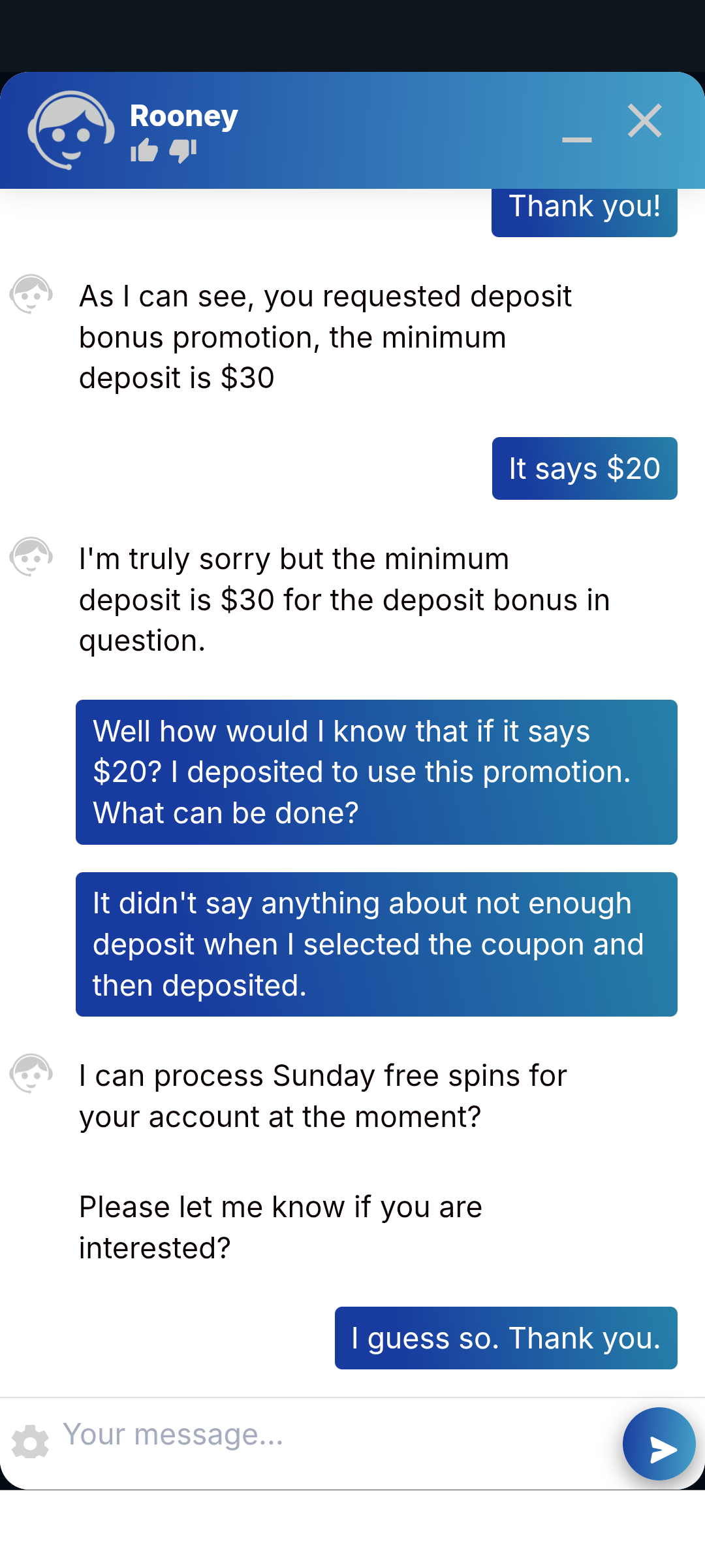 We sincerely apologize for the inconvenience. We’re pleased to let you know that a complimentary $100 free chip has been added to your account. Please note that the minimum deposit required for the bonus you requested is $30 and that has been corrected.