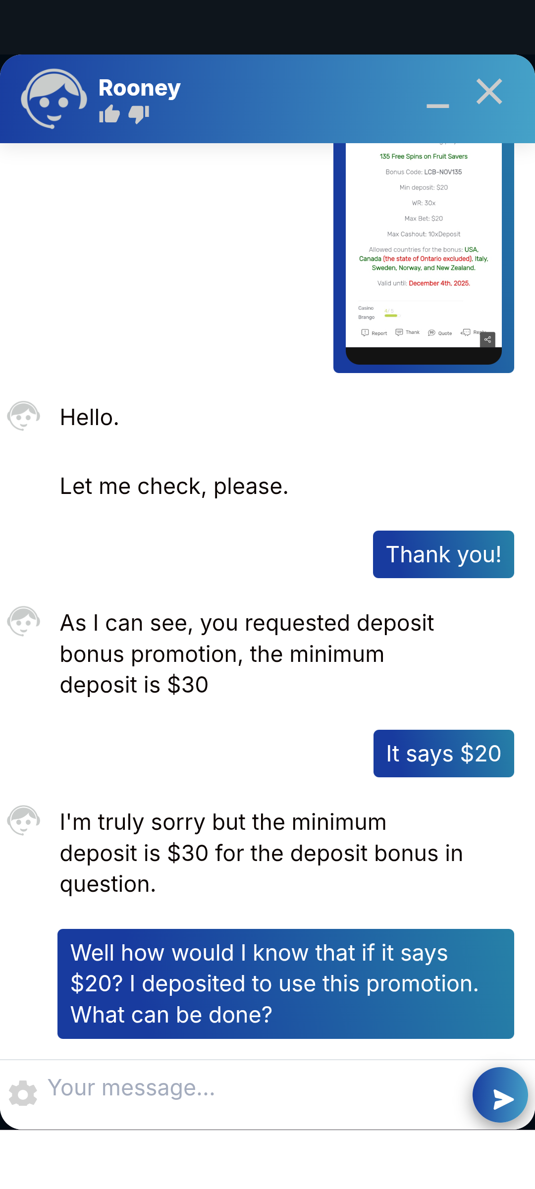 Greetings to Mikey! So I just had an odd situation with Brango. I used a promotion offered here on LCB. It stated for a minimum $20 deposit, I would also get 135 spins on Fruit Savers, mco 10x deposit. I've attached the promotion for your convenience. I went to the cashier, entered the promo code, LCB-NOV135. It redeemed it. I then made a $21 deposit, and then when I went to the game on the promotion, I started to play it, but it was taking my deposit for play. I went back to cashier, and it was active on my account. I was a little confused, but I thought, ok, maybe the spins are added after the deposit is played, as is sometimes the case. But there were no free spins available, so I went to chat to find out what the problem was. As you will see by the attached screenshots, chat said that this promotion has a minimum deposit of $30. I said, it says $20, and redeemed it and is active on my account. Chat says no, it's $30. I'm like, ok what now? I deposited specifically to use this promotion. They offered me 33 spins on Cash Bandit 3 as my only option. A hugely lesser option than the one I used. I won like $6, as opposed to 135 spins @.50 winnings I could have played with. I'm not sure who's responsible for this, as LCB is posting the coupon showing $20 minimum deposit, and Brango is saying different. All I know for sure is this isn't my fault, and I'm not sure how you feel would be a fair compensation, but I do believe that I'm owed one. Thank you for your time and assistance. Best Regards,C.