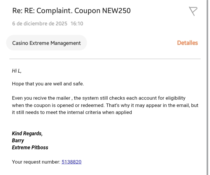 Je n'ai pas le droit d'utiliser de codes ni de profiter des tours gratuits des fêtes. Le service client m'a dit que j'avais un déséquilibre entre mes retraits de bonus et mes dépôts (en gros, je suis trop bon). Mais j'ai beau déposer, rien n'y fait. C'est vraiment rageant d'avoir été un joueur fidèle toute l'année (et d'avoir fait pas mal de dépôts) et de ne recevoir ni jeton gratuit ni tours gratuits pour les fêtes. Aucun point de fidélité accumulé depuis deux mois. Je ne reçois même plus de coupons boost dans l'onglet Promotions ! Mon compte est tellement bridé que je ne peux faire qu'un dépôt vierge et obtenir seulement 25 tours (sur un jeu désert) juste après, ce qui me démoralise complètement pour la nouvelle année. C'est comme si j'étais puni pour avoir joué intelligemment (j'adorais les bonus sans règles) par un casino où je jouais régulièrement les jours de paie. Je n'ai pas abusé des coupons. J'ai joué et j'ai gagné. Quel est le problème ?