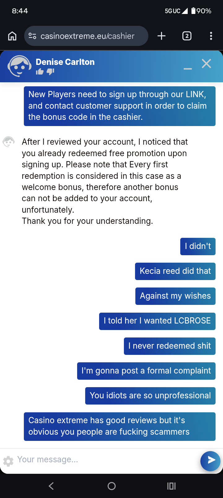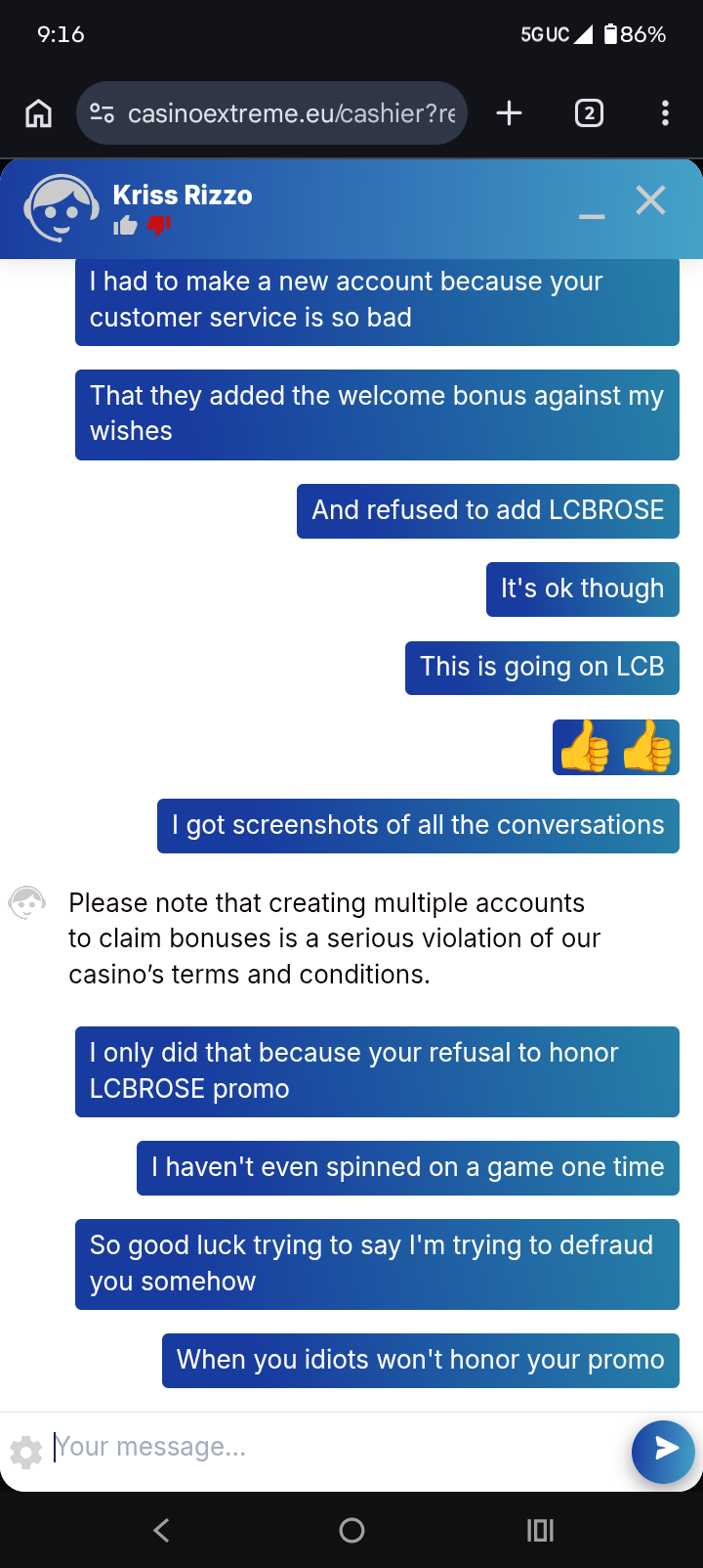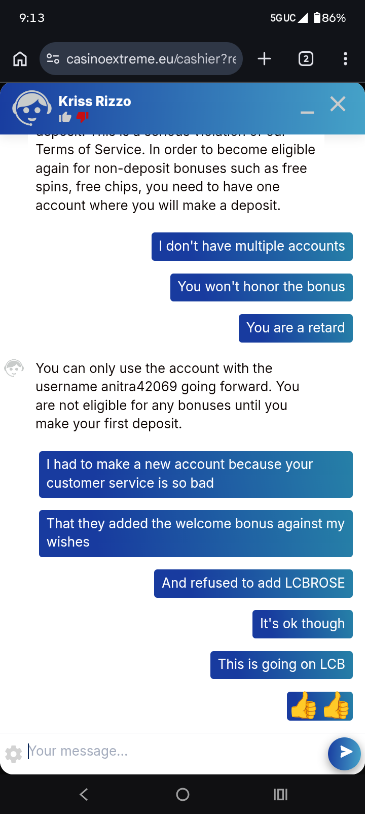 Did you complete all the required steps to claim the LCB bonus from the first account? Also, have you ever had an account at Extreme Casino before?