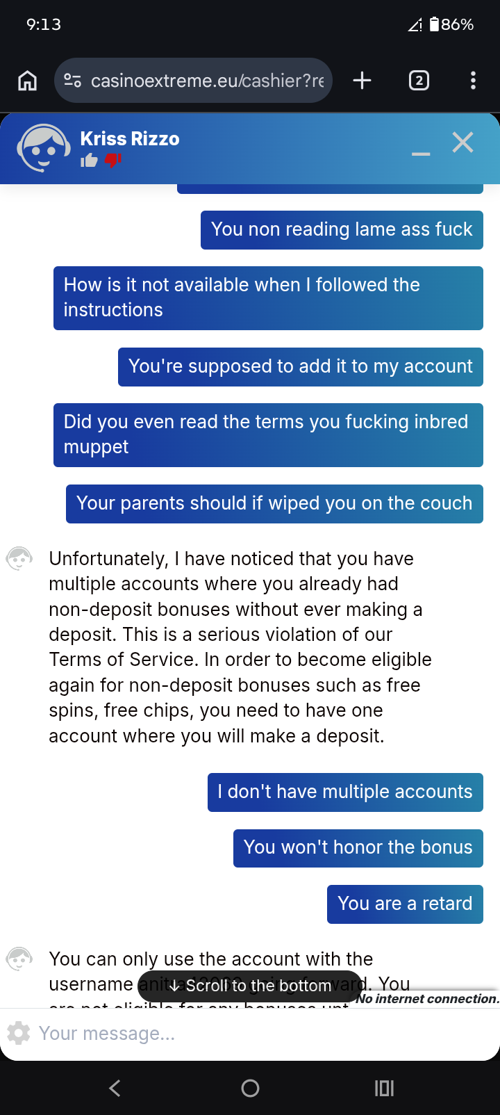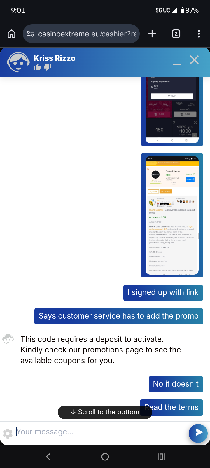 We received your complaint and notified the casino rep about it. We will update you as soon as we receive their response
