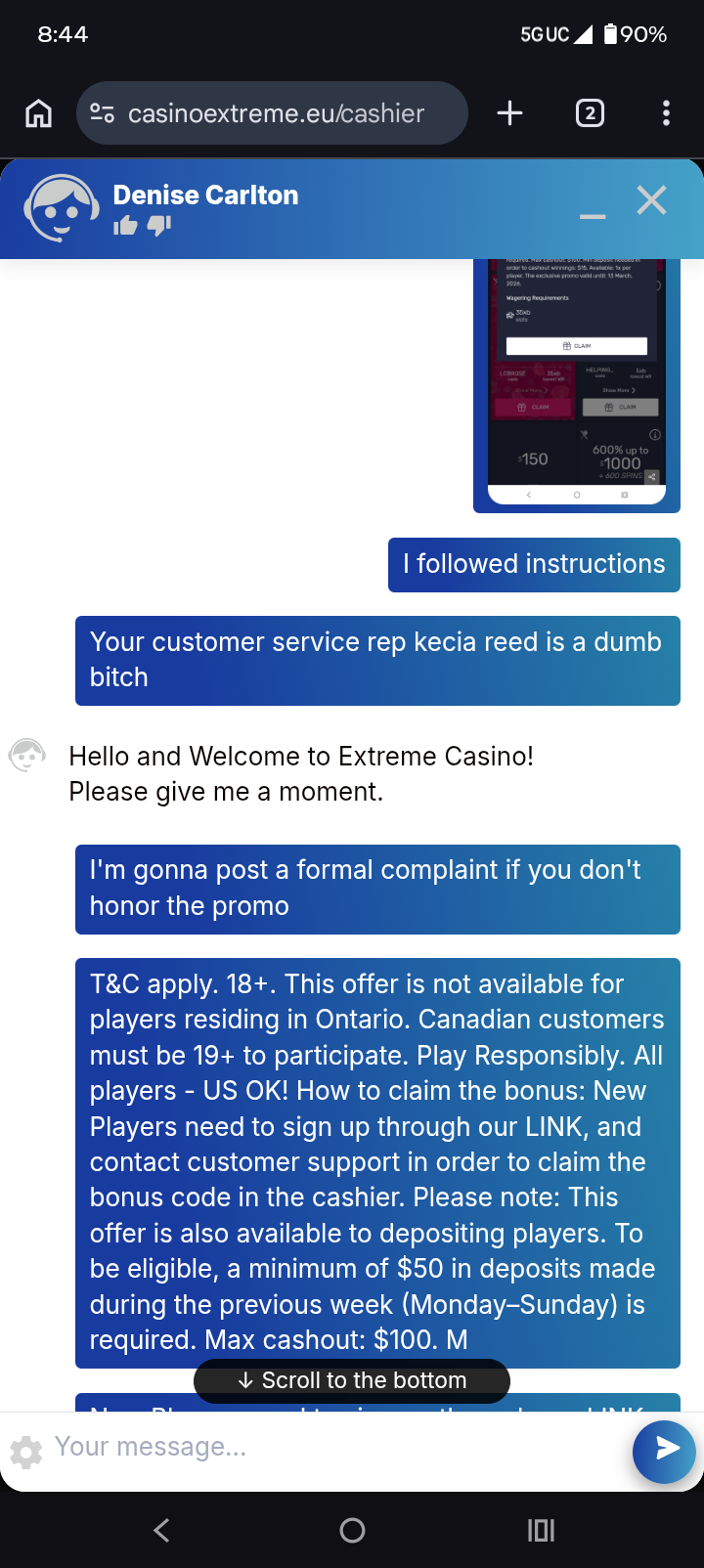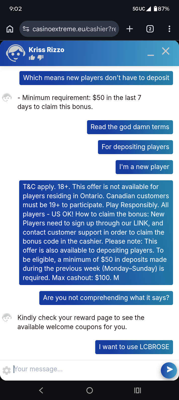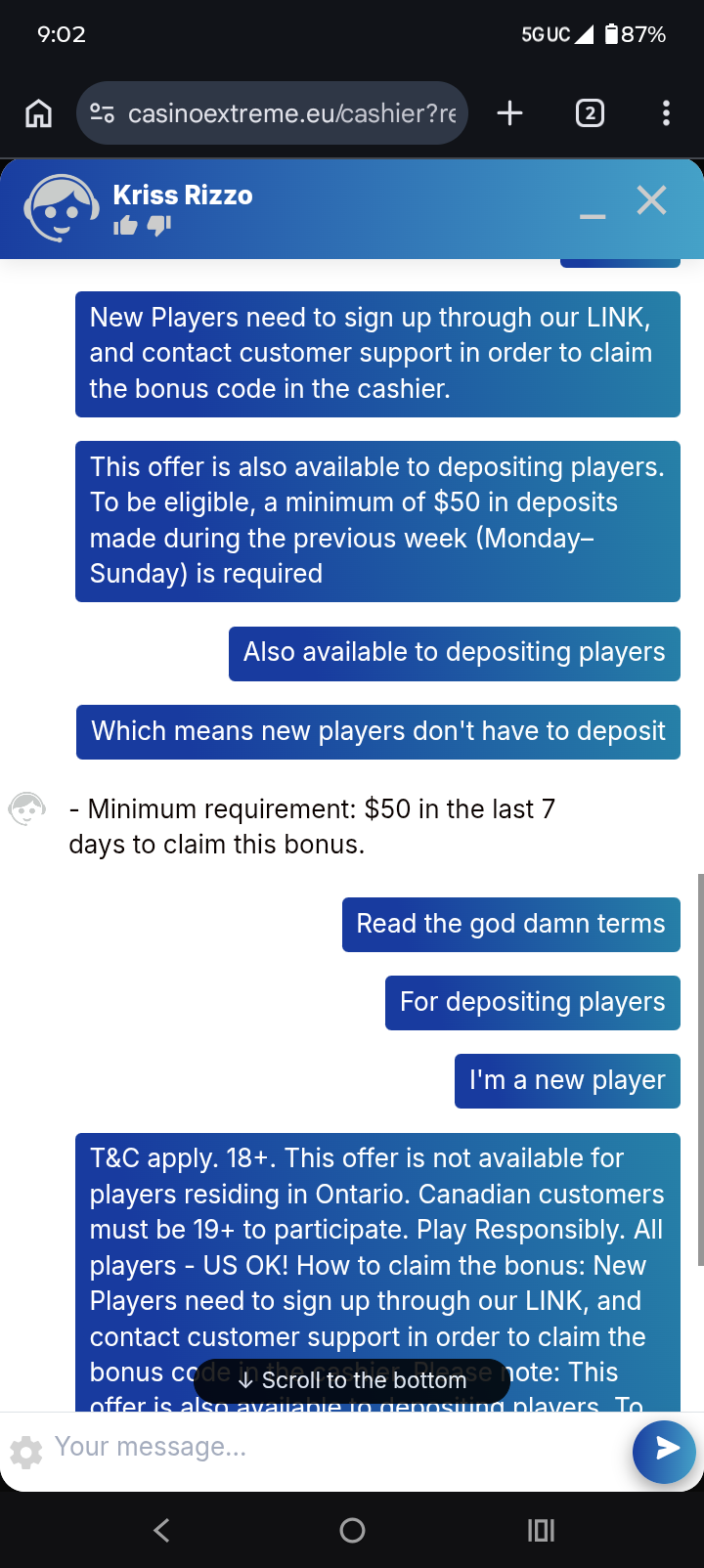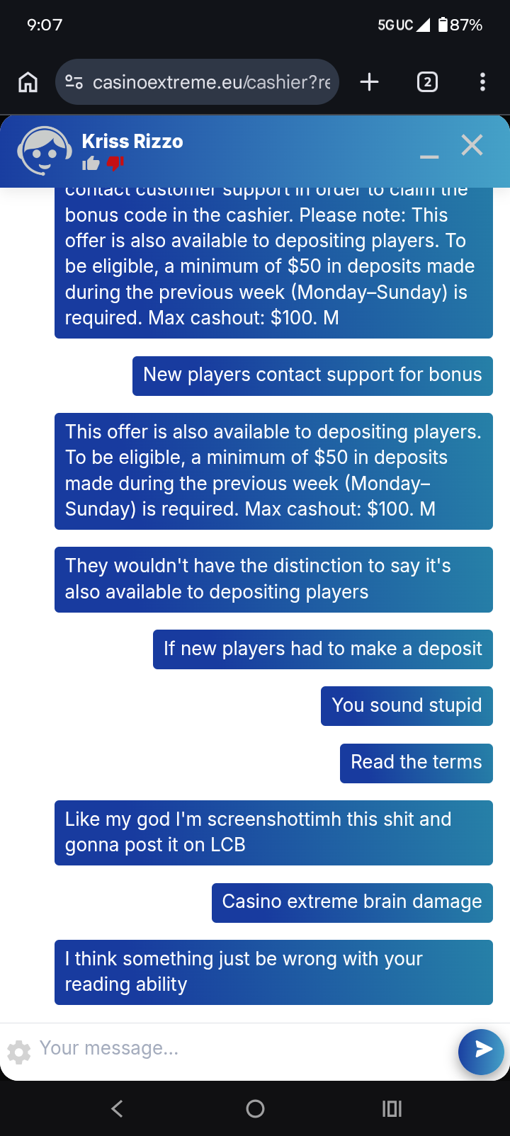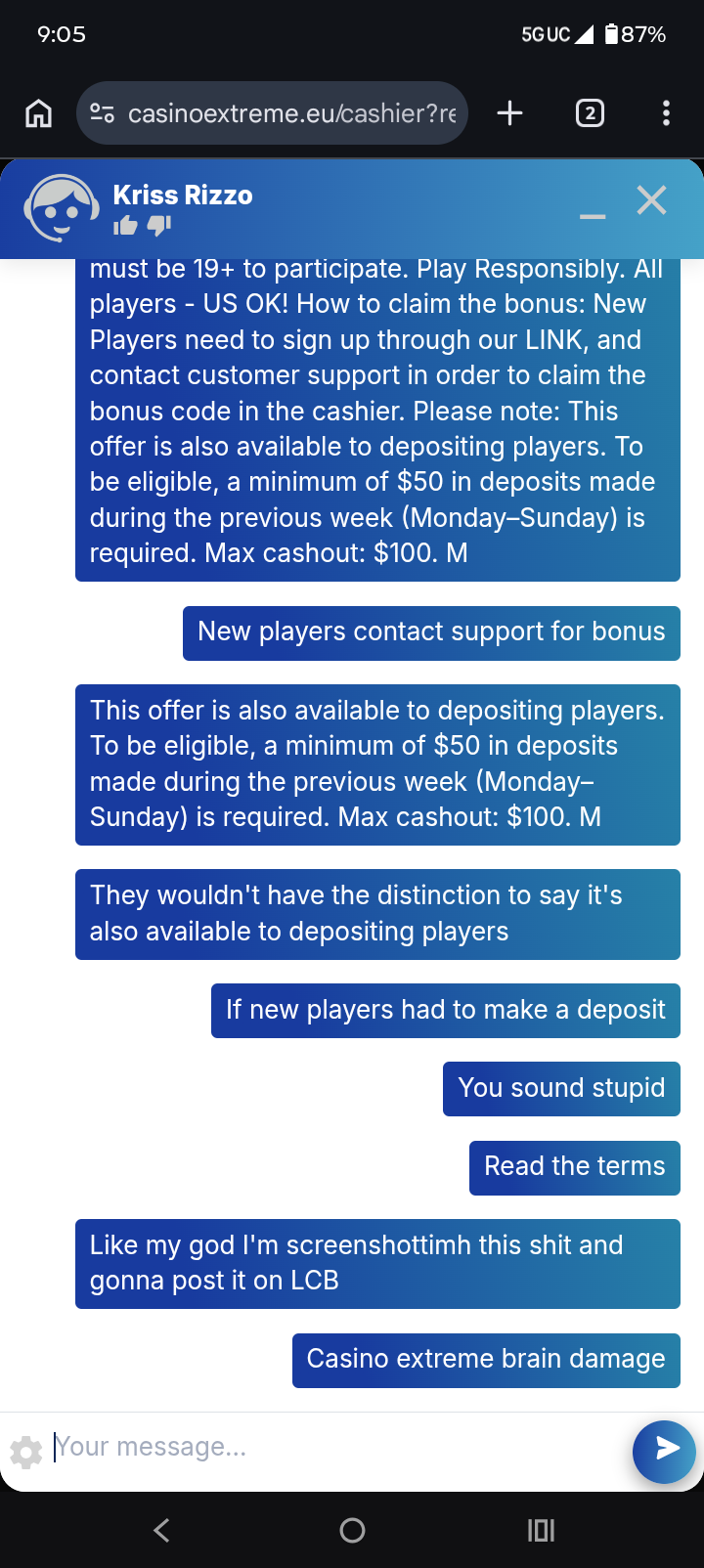 Iso my vip agent tells me to hit him up on what'sapp. Which I did. And low and behold he offers me some stupid 200% min dep 50$ with a 40x playthrough and a x10 mco like I'm stupid or something lol