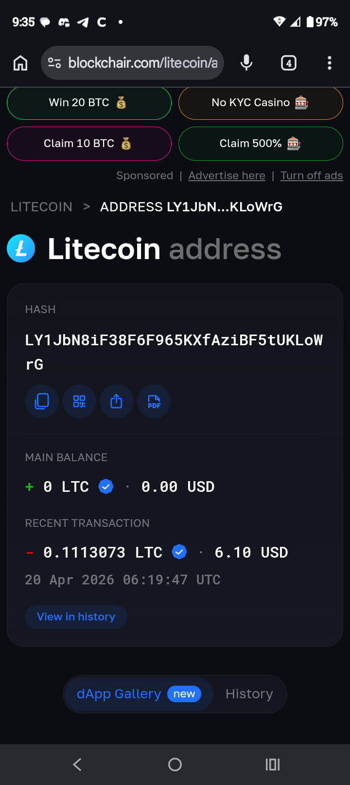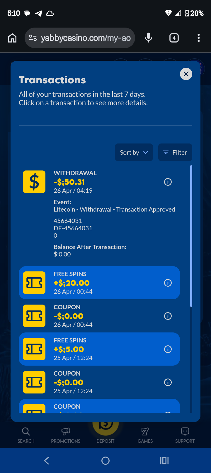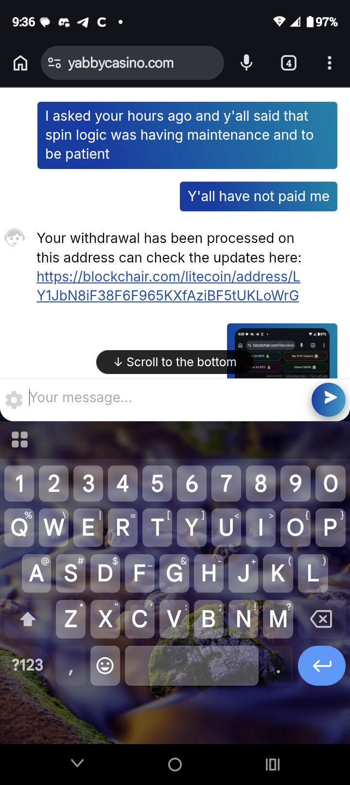 I put in a withdrawal for $50.31. I've never received it it's been half a day they're trying to say now that they sent it and I asked for a blockchain ID and they sent me the address to my own wallet it shows right there that haven't been a transaction on this wallet since April 20th so obviously they didn't send it to me and they're trying to say they are this is ridiculous they're flat out trying to rip me off this is ridiculous on the yabby's part I'll never deposit here again