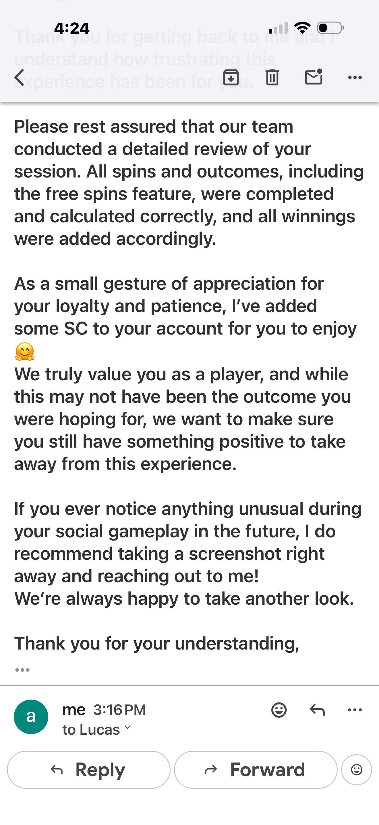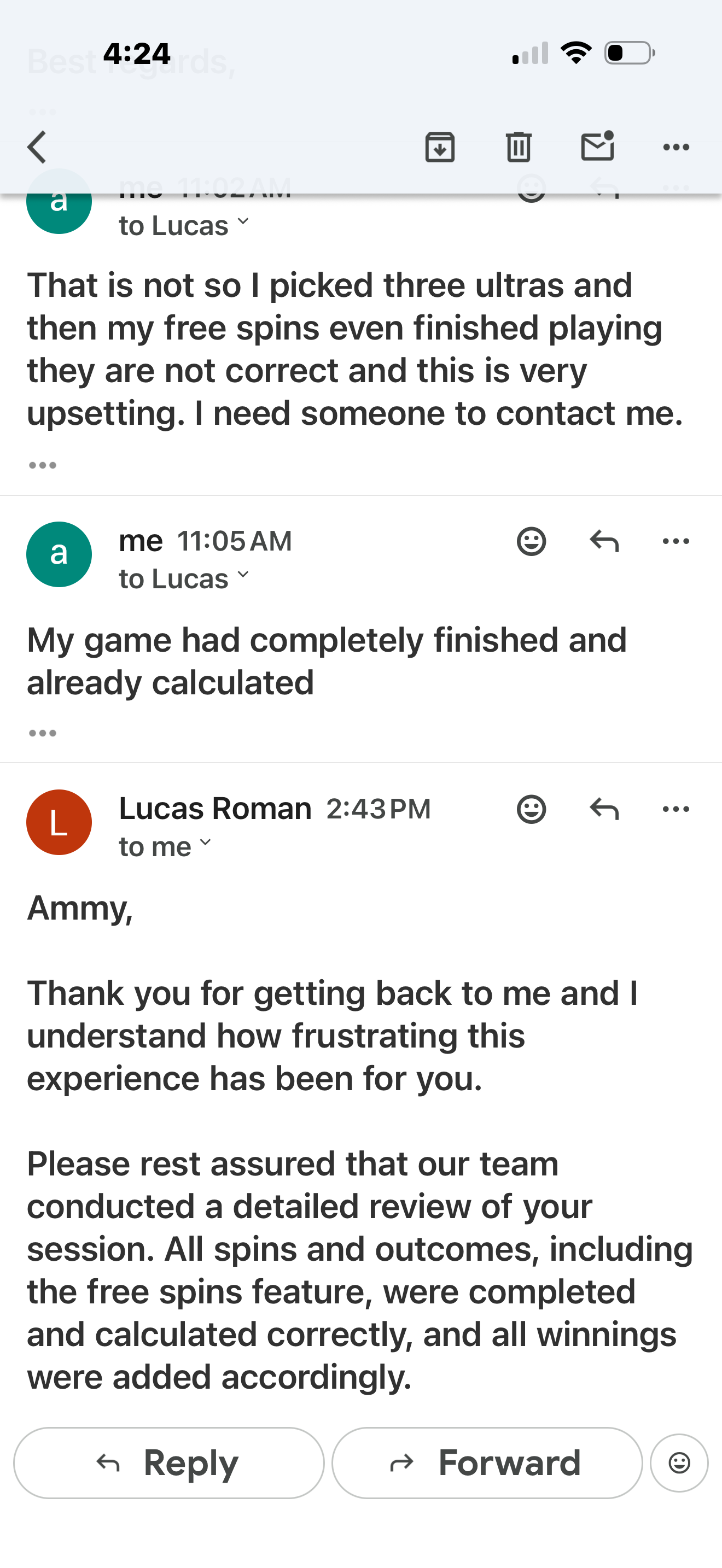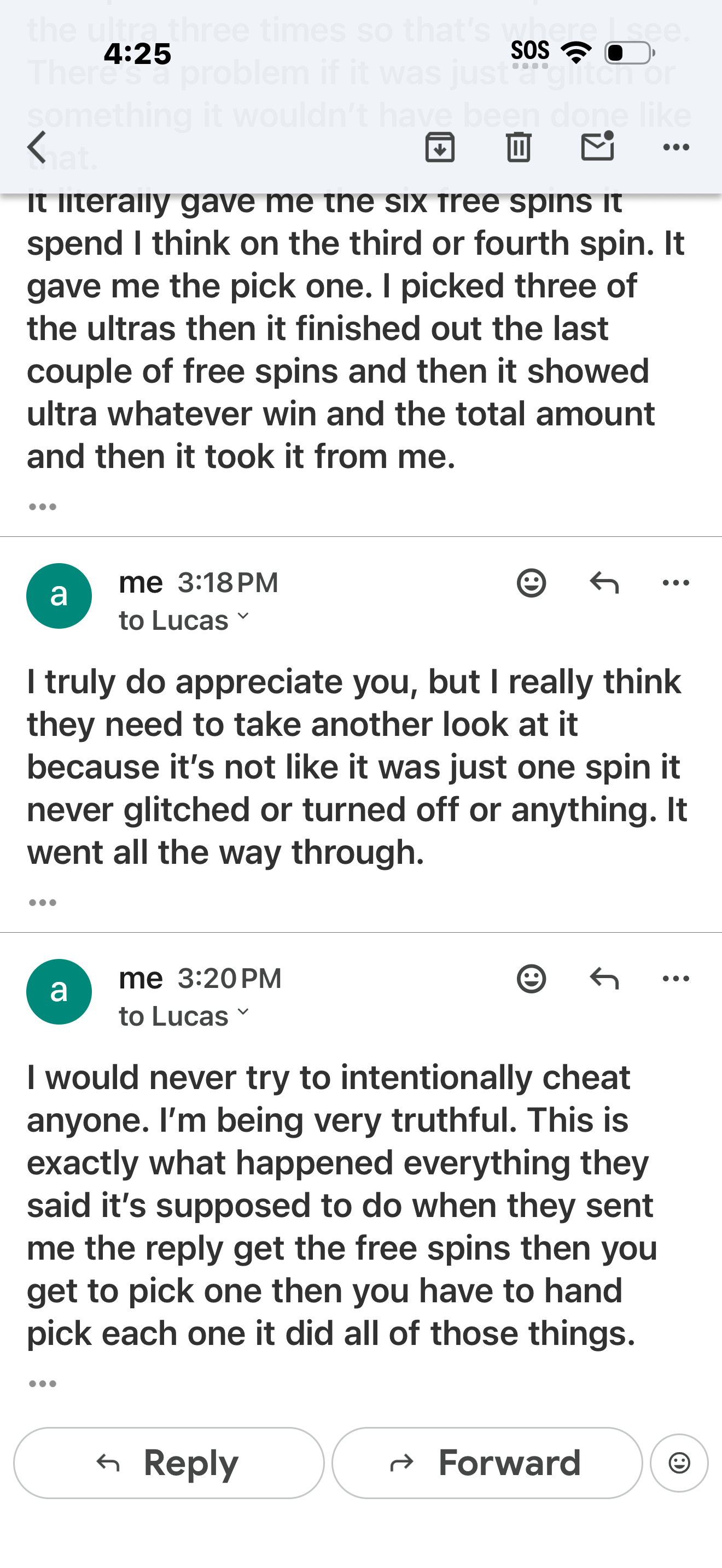 I won $20,000 SC on Chumba yesterday morning it was on a new game called pigs and pots. I got free bands then during the free bands I got the pick three and then handpicked and ended up with three ultras which was $20,000. It added it up then it finished with the free spins at the end it said ultra win then, it was taken directly right back out. I have attached my correspondence with them. I think this is ridiculous it will not let me send the rest of my replies. I will send them on the next reply, maybe