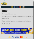 J'ai pu examiner la situation et il semble que votre dépôt gagnant ait été refusé par votre banque. Nous créditons les dépôts immédiatement pour votre commodité (et votre divertissement !), mais toutes les transactions bancaires, entrantes et sortantes, doivent transiter par nos prestataires de paiement tiers. Nous n'avons aucun moyen de savoir si le dépôt a été refusé avant que cela ne se produise, parfois plusieurs jours plus tard. Dans ce cas précis, le dépôt (le premier et unique dépôt effectué jusqu'à présent) n'a pas pu être finalisé.