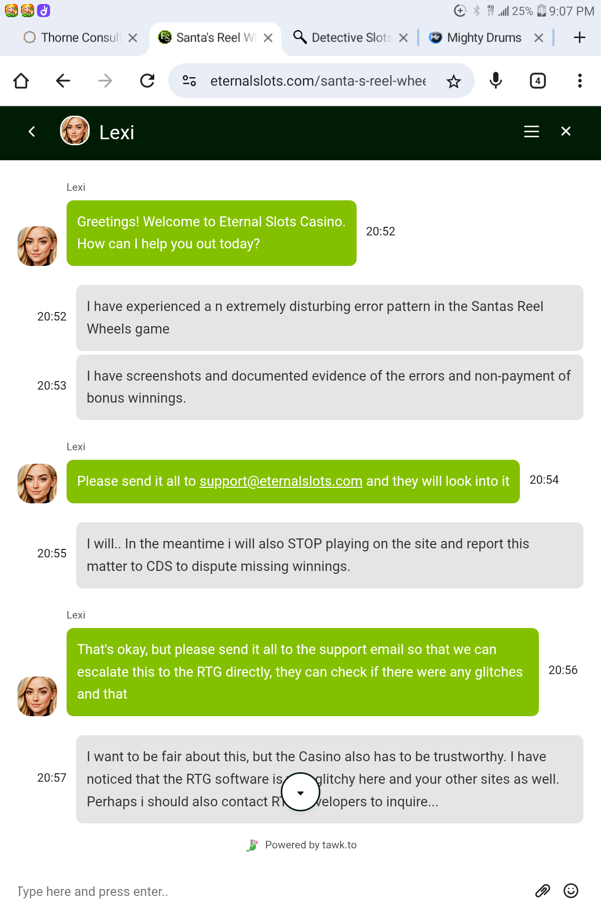 I have experienced an extremely disturbing error pattern in the Santas Reel Wheels game and others while playing on Eternal Slots and the sister casino sites. I have screenshots and documented evidence of the errors and non-payment of bonus winnings. The game history doesn't reflect correct wagering amount or payout details per spin. Bets are zeroed in the history of the games when you research the account. I have reached out to the casino support team regarding this issue and to no avail, I was simply dismissed by the representative, Lexi.
