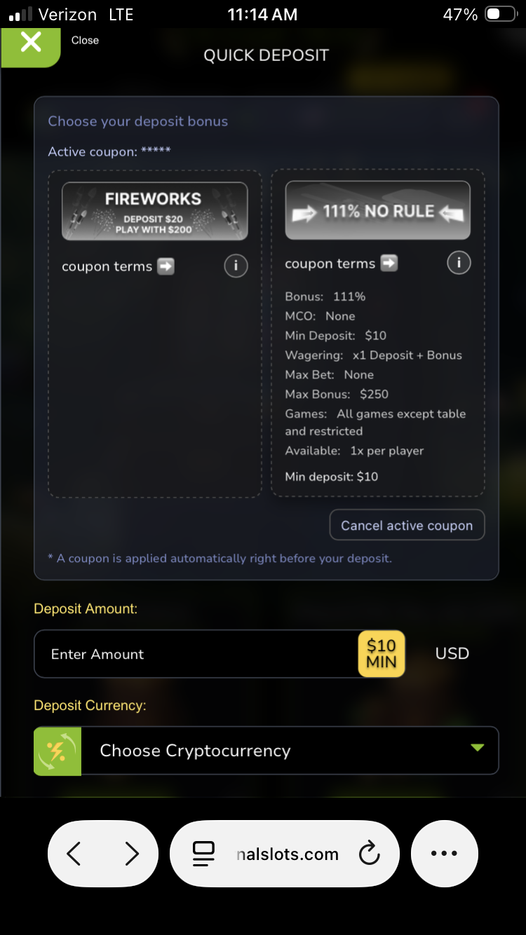 Si vous n'aviez pas déjà utilisé votre dépôt, nous aurions appliqué le coupon immédiatement.Si vous êtes prêt à nous donner une seconde chance, je veillerai personnellement à ce que, si vous décidez d'effectuer votre prochain dépôt de 10 $, le bonus NORULE de 111 % soit activé sur votre compte à titre d'exception.