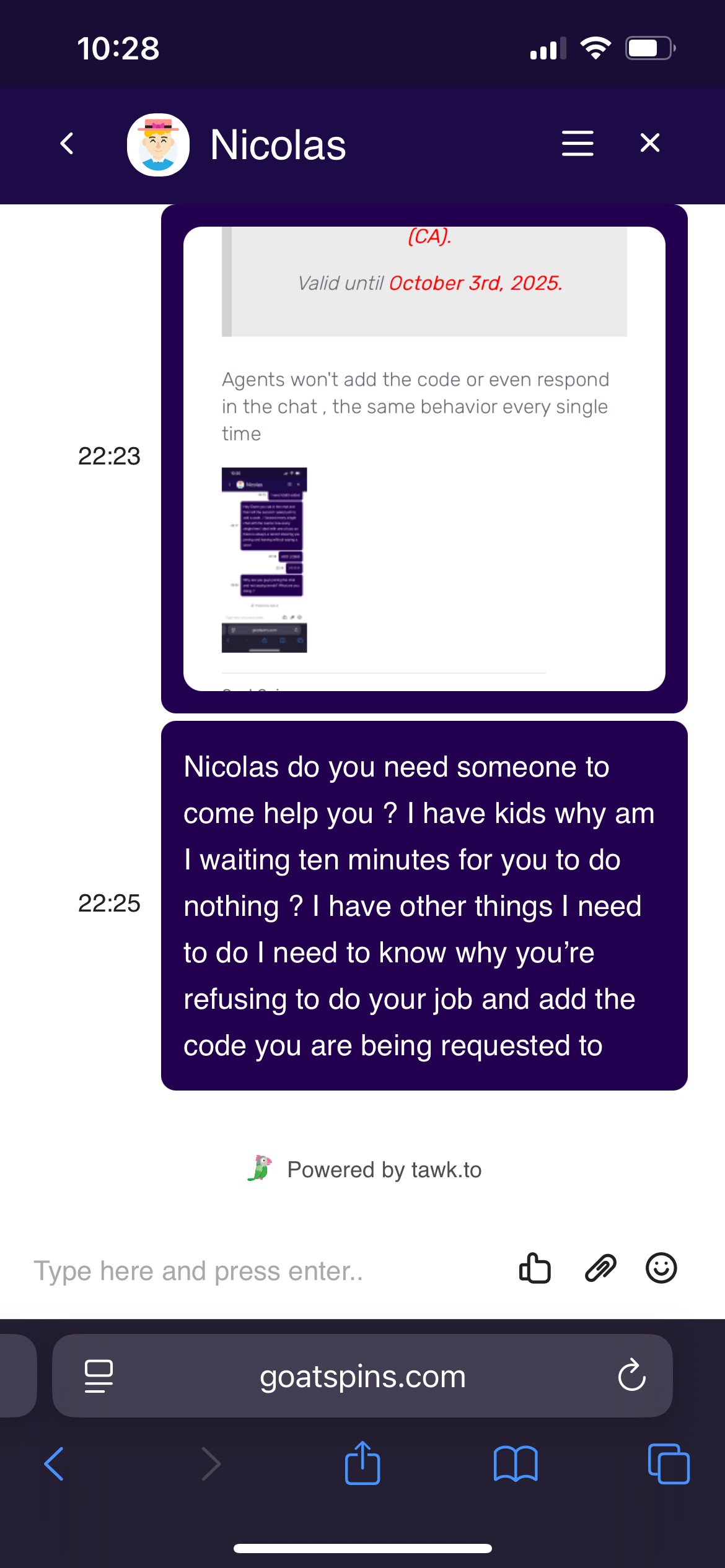 Bonjour, hier, j'ai fait un coupon de dépôt BTC de 25 $ GTRUSH200 qui indique que la mise maximale est de 5 $... J'ai donc fait en sorte à 100 % de ne pas dépasser la mise maximale de 5 $ pendant toute la DURÉE du coupon et du jeu. Dès que je reçois la notification m'indiquant que mon coupon déposé et ma mise sont TERMINÉS... JE SAIS QUE JE SUIS AUTORISÉ À PARIER PLUS DE 5 $ car les conditions générales stipulent, et je cite « sauf indication contraire », ce qui signifie que si je ne suis pas informé du statut de fin de mon coupon, la mise maximale est de 5 $. Cependant, j'ai reçu une notification m'indiquant que mon coupon est terminé et que j'ai maintenant un solde retirable. Ce qui signifie que le solde actuel après la fin du coupon est à 100 % de mon argent ! Maintenant que j'ai réalisé que le solde m'appartenait entièrement et que le coupon n'était plus actif, j'ai commencé à parier au maximum 9 $ par tour. Après quelques tours, j'ai décidé de retirer mes gains. Quelques minutes plus tard, j'ai reçu un message m'indiquant que j'avais enfreint les conditions générales en pariant au-delà du maximum de 5 $, alors qu'en réalité, j'avais maintenu la mise sous 5 $ pendant toute la durée du bonus/coupon actif. Dès que j'ai reçu la notification m'indiquant que le coupon était terminé et que j'étais On m'a attribué le solde complet, cet argent m'appartenant à 100 %. S'ils voulaient inventer une série d'échappatoires à la règle du coin du chat concernant ma violation de la règle de mise maximale, vous auriez dû me rembourser mon solde dès la fin du coupon, qui était d'environ 325 $. Je suis extrêmement déçu d'avoir été accusé d'avoir enfreint les TCS et les Cs, alors que je lis toujours les règles avant d'effectuer un dépôt pour un coupon. Je ne suis pas stupide, je connais les règles et je suis blessé que les agents de Goatspins m'aient traité injustement. J'ai demandé à la direction des paiements bancaires de consulter l'historique de mes paris et vous conviendrez que ma mise n'a JAMAIS DÉPASSÉ LE MAXIMUM DE 5 $ PENDANT MON COUPON DÉPOSÉ/MES JEUX. AU MOINS, REMBOURSEZ-MOI MON SOLDE DE 325 $ DÈS LA FIN DU COUPON. J'AI GARDÉ LA MISE SOUS 5 $ JUSQU'À LA FIN DU COUPON, MAIS À LA PLACE, GOATSPINS A PRIS On m'a remboursé la totalité de mon solde et on m'a rendu mon dépôt de 25 $, ce qui est une véritable claque, sachant que j'ai gagné 325 $ au total, en toute honnêteté. J'ai augmenté ma mise de plus de 5 $... après que mon coupon déposé ait été utilisé. On me devait 519 $, mais on m'a remboursé les 25 $, ce qui donne 494 $. Je suis prêt à faire au moins la moitié et à récupérer les 300 $ que j'ai gagnés en toute honnêteté. Ce qui est juste est juste. J'attendrai une réponse respectueusement. Merci pour votre temps, Bryan Kidd. (J'ai fait confiance à Goatspins et ils n'ont jamais essayé de me voler mes gains ni de me faire des conneries.) cdk.goatspins:3072.com JE N'ARRIVE PAS À CROIRE QUE JE SOIS TRAITÉ DE CETTE FAÇON. J'AI PLUS DE 10 RETRAITS AVEC EUX. TOUT ÉTAIT BIEN JUSQU'À CE MOMENT. COMPLÈTEMENT CHOQUÉ.
