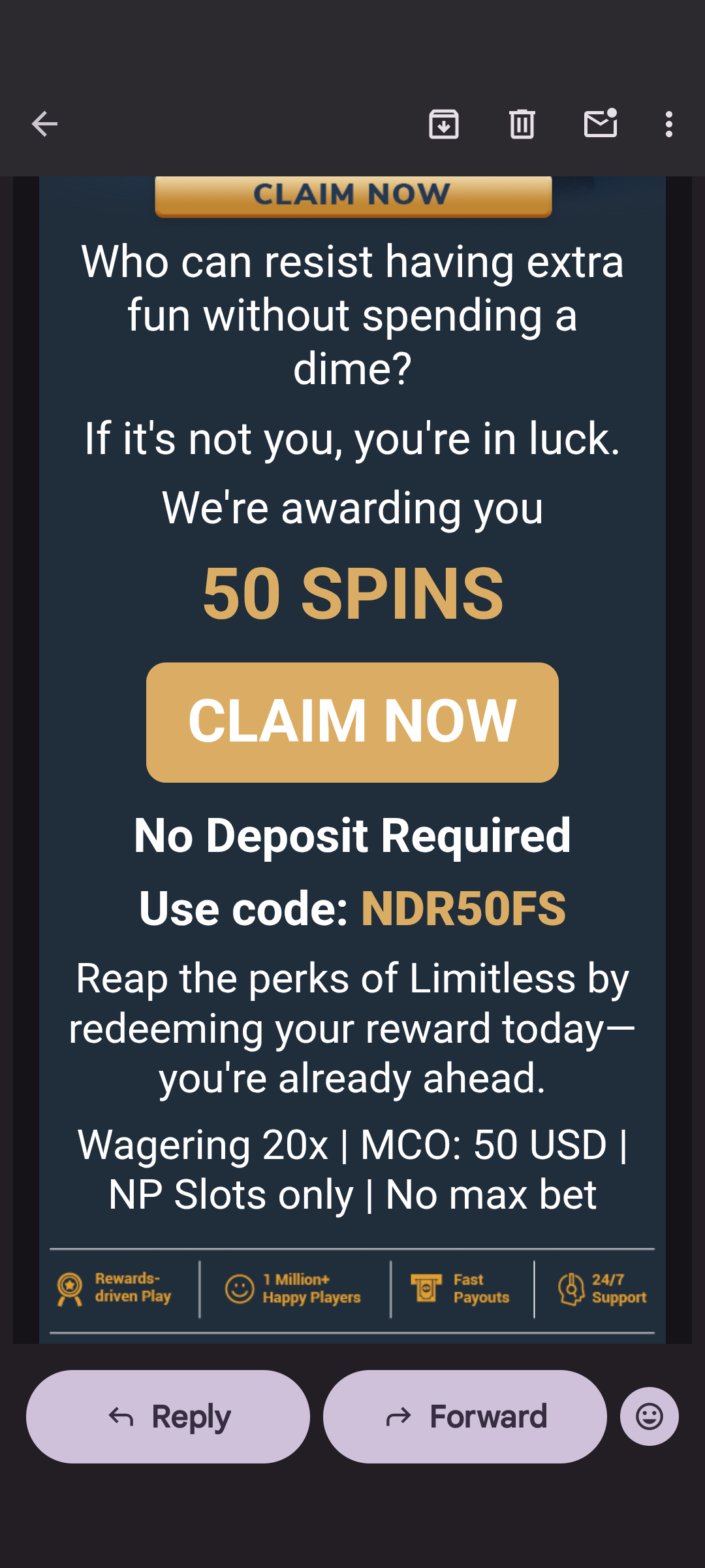 Greetings! I'm inquiring about a bonus email I received, code NDR50FS. I have received this gift from Limitless, Brango, and Extreme several times over the course of a few months, I'm assuming because of my deposit history, with no withdrawals. I tried to redeem this recent one at Limitless, but was told this promotion can only be redeemed once, per IP. Lol, I thought oh crap, here we go with some made up nonsense. I told chat to check my account, I redeemed an identical email gift on June 30th, and July 18th, so they can see that's incorrect. Also it doesn't state anywhere one redemption per IP. I Was calm and polite.They stuck with their refusal, and even said the system won't let them add it., and simply gave me the usual " there's nothing that can be done.," Well , there went my little fun time I was looking forward to all day. This really is not acceptable customer service. If they send me an email offering a gift for my loyalty, and I get excited to play, it should be honored, especially considering that it's been honored several times across all of the brands, easily proven by checking my account. Acting like I am either a liar, or stupid. Please assist me with getting this coupon redeemed. Thank you!