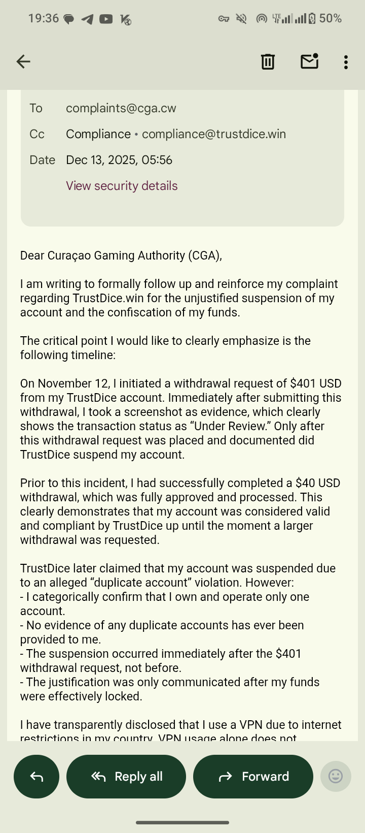 Since it's been 48 hours and we haven't heard back from the member, yet we have the response from the casino, we will mark case #3829 as RESOLVED.