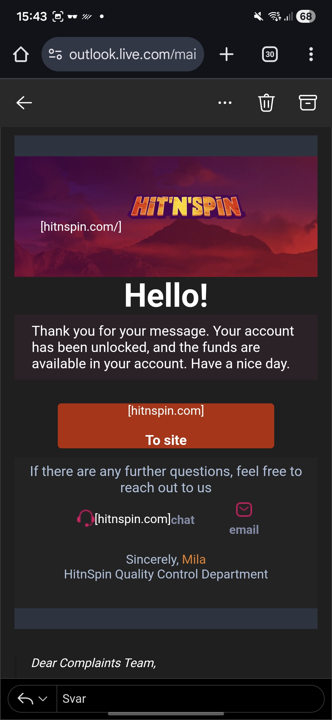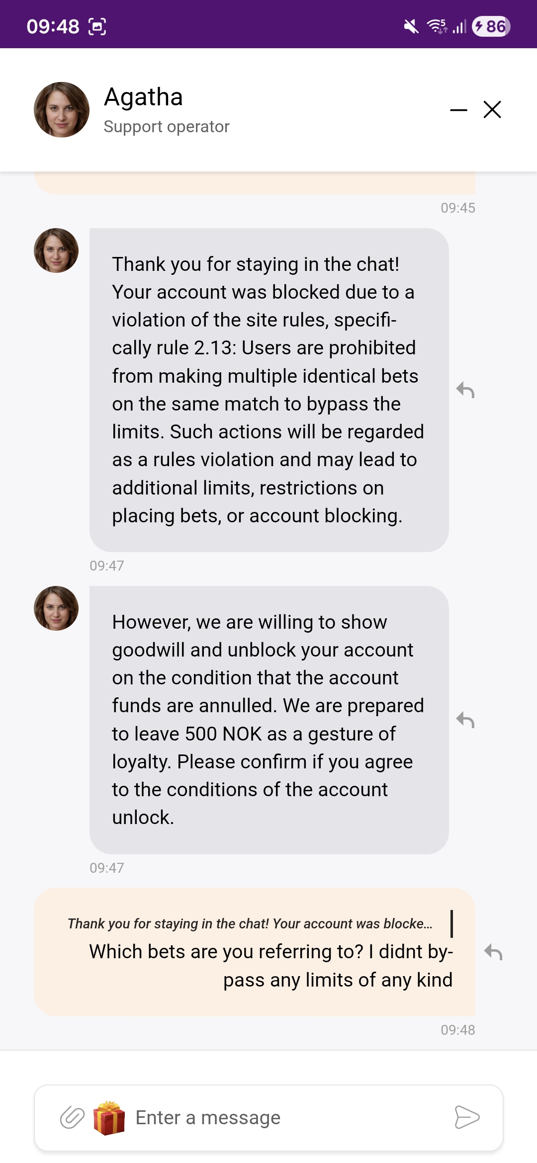 Hello dear Lcb team! Posted this complaint on two other sites, but decided to try my luck here as well. The block occurred after my request had been pending for a couple of days. After the withdrawal request and additional KYC approval, no prior warnings or communication were taking place with the administration. 28 October 2025: Deposited around 3,200 NOK (BNB) + 14 USDT. 28 October: Requested around 7200 NOK to be withdrawn (above 499 EUR tier). Request is pending, but Live chat confirmed additional KYC required for large amounts. 29 October: Additional KYC is submitted where another selfie and passport + open site is present. Approved on the same day or next, account fully functional as there were no warnings or blocks. As i cancelled the withdrawal, played some more, then requested again, the status remained unchanged or pending from 28–31 October. 4 full weekdays, as requests arent being processed on Saturday and Sunday. Had several multiple support chats, such as the one where i checked regarding crypto fee refund. Incorrect amount in BNB was sent, they fixed that and manually added the funds. Had the opportunity to look at my account activity again as the process was manual, but zero mention of any issues. On the 31 October or 1 November i cancelled my pending withdrawal to do some bonus buys on Pragmatic Play and got extremely lucky in the end, as i Won 12,836.40 NOK with real funds. Bet ID: 97062752897082 2139 x multiplier after which my total balance were close to 16k nok and 17900 on the day after that as i did a couple more buys. Talked to another agent to confirm the processing times, he congratulated me and confirmed funds were withdrawable. Requested one withdrawal of 5,800 NOK in USDT that day, but as withdrawals arent processed during weekends the status were pending. On the 3 november, account immediately blocked. After getting in touch with the Support, they cited a sports-related rule (Rule 2.13), but no prior notice had been given. My main points are that additional KYC was triggered by a withdrawal request larger than 499 EUR, so HitnSpin had full access to my activity during verification. The additional documents were uploaded on the same day, I got approved quickly, where the team most likely took notice of all prior play. No warnings during 4/5 day pending period post KYC were issued. This case overall feels like selective enforcement of a certain rule, as the Agent confirmed withdrawal eligibility post-win. I asked if the funds may be withdrawn right away, got told that they may, but when it was time to actually send the funds a reason not to pay was found. From a completely neutral perspective - HitnSpin had several days to notify me if abuse of any kind took place, but didnt do so before my large win. Approval of the extra KYC steps most definitely imply that they had a look into my overall activity. The vague reference from the support feels like selective enforcement, as no limits were implemented prior to the ban.