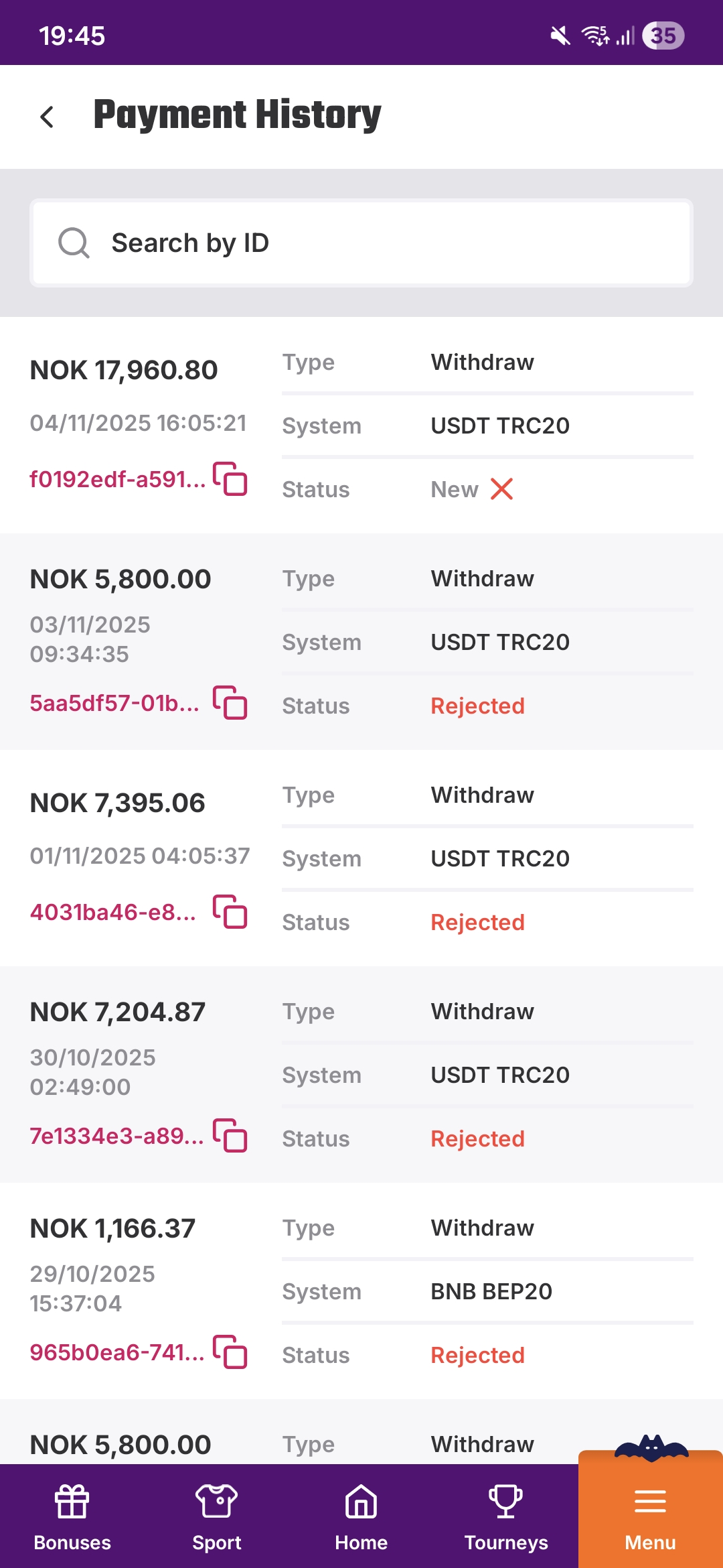 Le 25 décembre, à 8 heures du matin, j'ai effectué un dépôt avec . usdt, mais plus de 3 jours se sont écoulés et l'argent n'a pas été reçu sur le solde. le statut du dépôt est sélectionné comme incomplet. et le même jour à 20 heures, j'ai commandé un paiement également en USD et il n'est pas non plus traité pendant plus de 60 heures. s'il vous plaît, aidez mon courrier *****@mail.ru