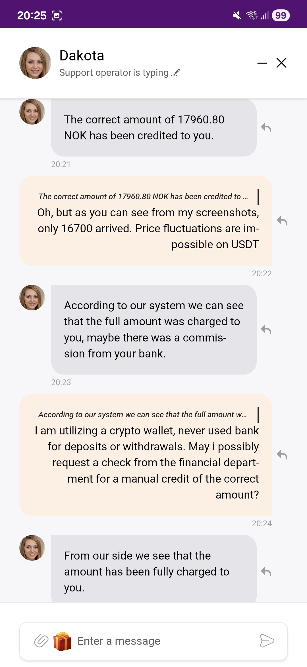 Attaching screenshots from my wallet, as well as the dialogue with the agent. The correct value of 17960 nok in usd = 1775 usd