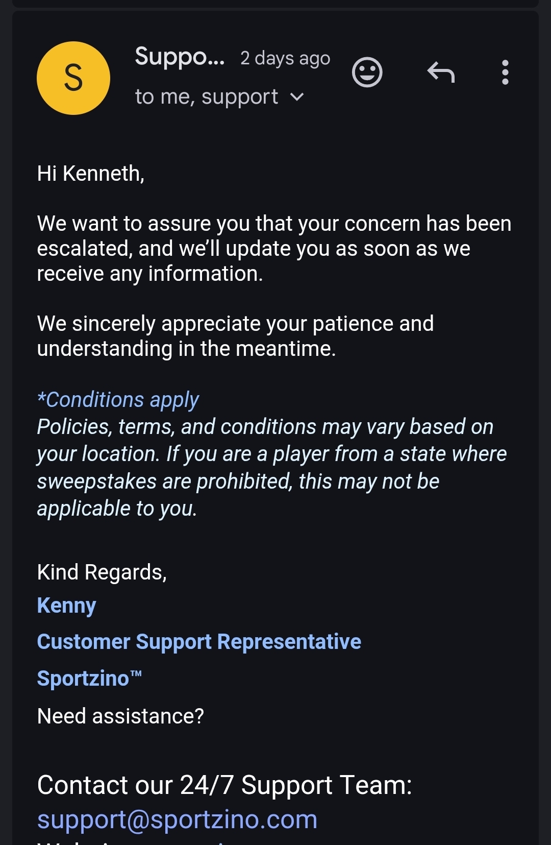 Thank you for sending us your casino username. Your complaint, along with all the details you provided and the casino username, has been forwarded to the casino rep.